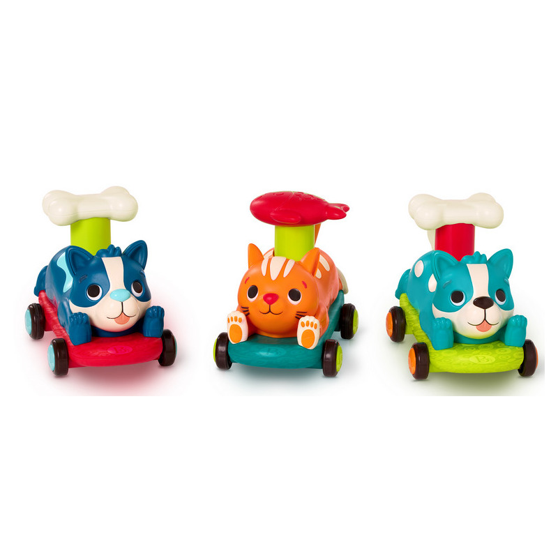 Wesoły samochodzik inspirowany światem zwierząt. Wystarczy nadusić od góry dłonią, a wyposażony w 4 kółka piesek lub kotek śmiga aż miło, wesoło merdając ogonkiem. Idealny dla małych rączek! Samochodzik wysyłany jest losowo.