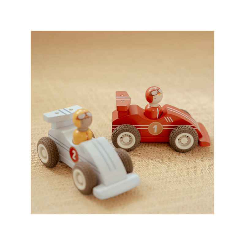Komplet zawiera dwie kolorowe wyścigówki z wyjmowanymi kierowcami, gotowe do startu w dziecięcych wyścigach. Wykonane z naturalnego drewna i pomalowane bezpiecznymi farbami wodnymi, autka zachwycają jakością i estetyką.
