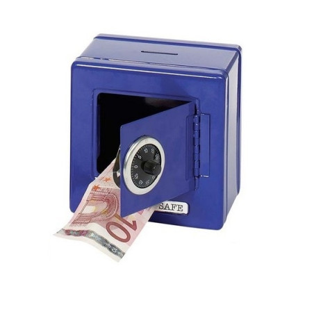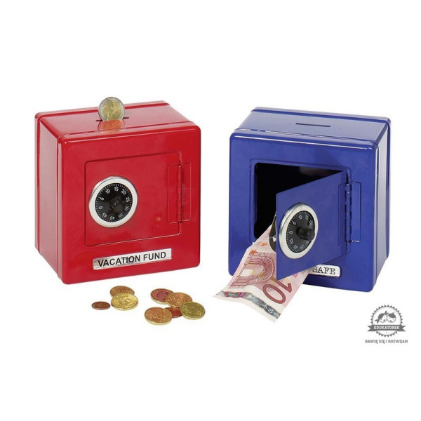 Skarbonka wykonana jest z metalu, posiada zamek szyfrowy, co jest dodatkową atrakcją.