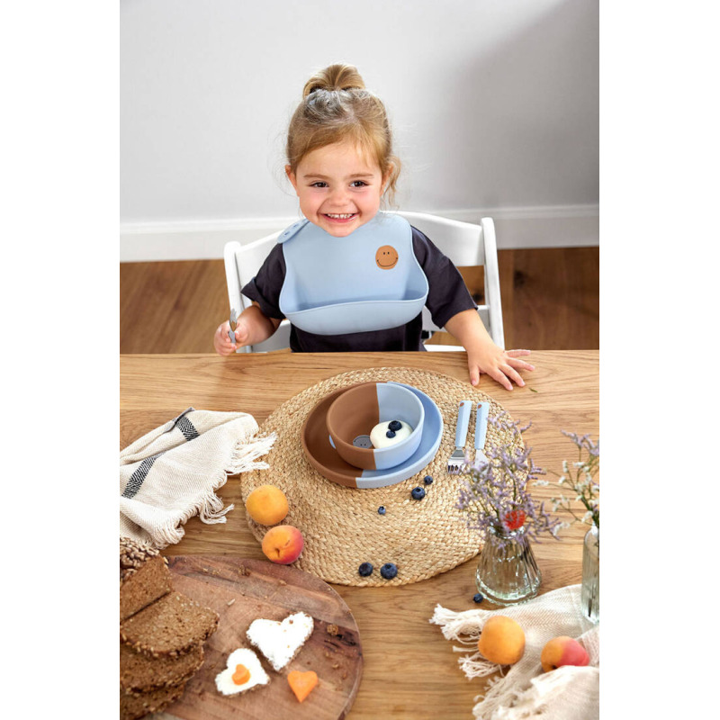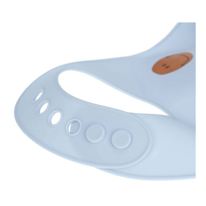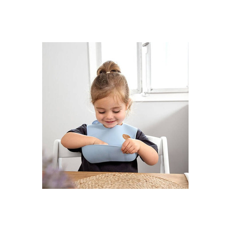 Dzięki miękkiemu, silikonowemu śliniakowi w kolorze niebieskim cały posiłkowy bałagan wpadnie do kieszonki! Proste zapięcie z regulowaną szerokością nie uwiera i nie krępuje ruchów dziecka, a przy tym utrzymuje śliniak we właściwym miejscu.