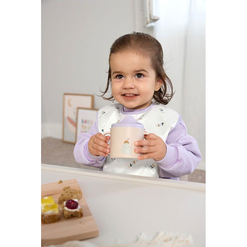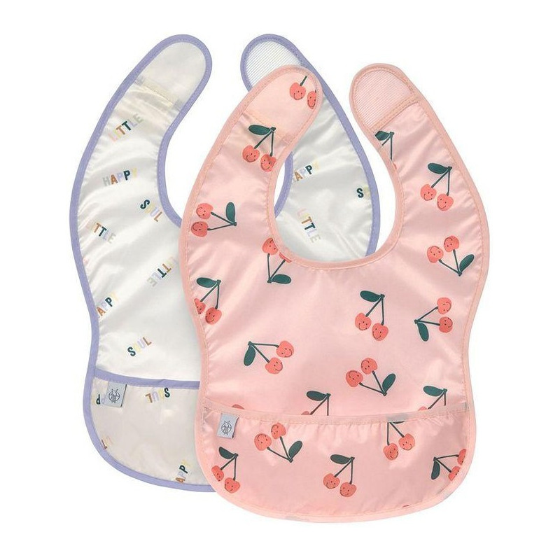 Zestaw dwóch praktycznych, łatwo zmywalnych śliniaków marki LASSIG. Są duże, miękkie i wykonane z wodoodpornego tworzywa. Jeden różowy z motywem uśmiechniętych wisienek (multiprint), drugi biały z kolorowym napisem HAPPY i pastelowym obszyciem. Zapięcie na rzep zapewnia komfort użytkowania. Śliniaki przeznaczone są dla dzieci od 6. do 24. miesiąca życia. Sprawdzą się przy płynnych oraz brudzących posiłkach, karmieniu i pierwszych próbach samodzielnego jedzenia. Na dole mają kieszonkę np. na resztki pokarmu, które nie trafiły do buzi. Dzięki temu masz pewność, że nie zaplamią ubrania maluszka.