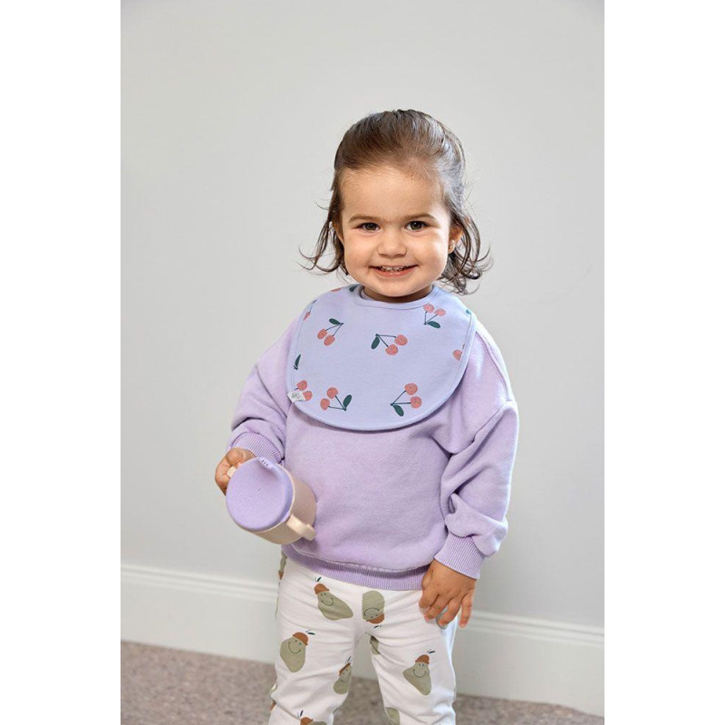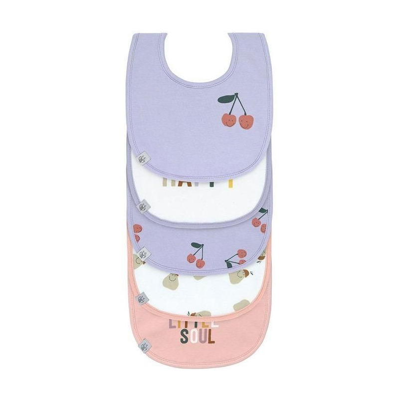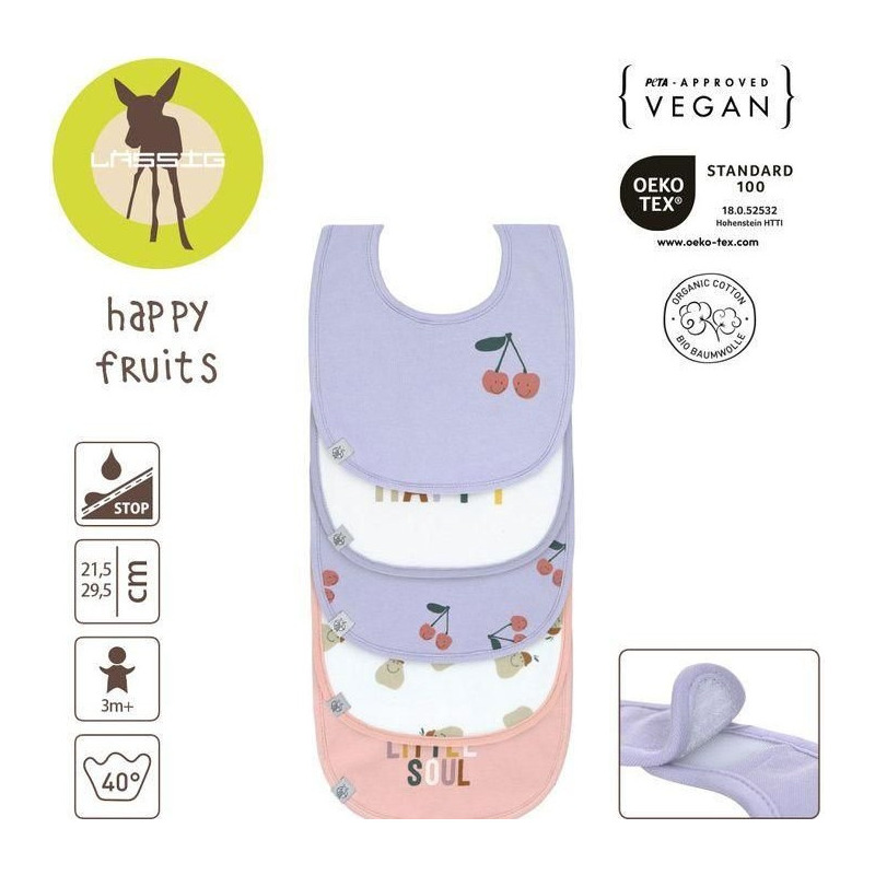 Zestaw pięciu miękkich, bawełnianych śliniaków marki LASSIG. Każdy inny: dwa lawendowe z motywem uśmiechniętych wisienek, różowy z napisem HAPPY LITTLE SOUL, biały z motywem uśmiechniętej gruszki oraz biały z kolorowym napisem HAPPY. Wodoodporne, bezpieczne, przydatne przy karmieniu oraz pierwszych samodzielnych posiłkach. Zapięcie na rzep zapewnia komfort użytkowania.