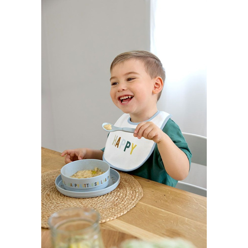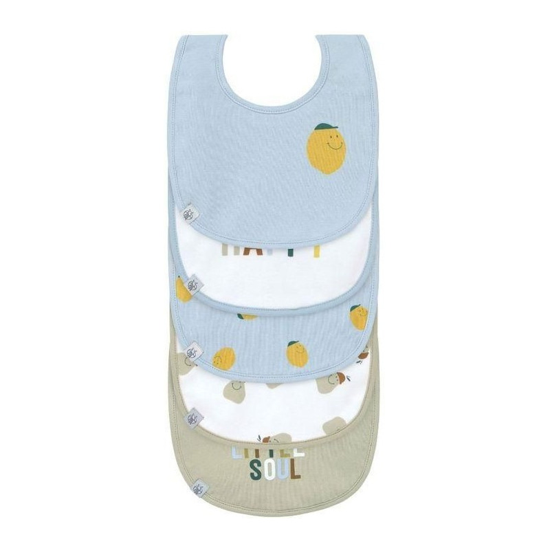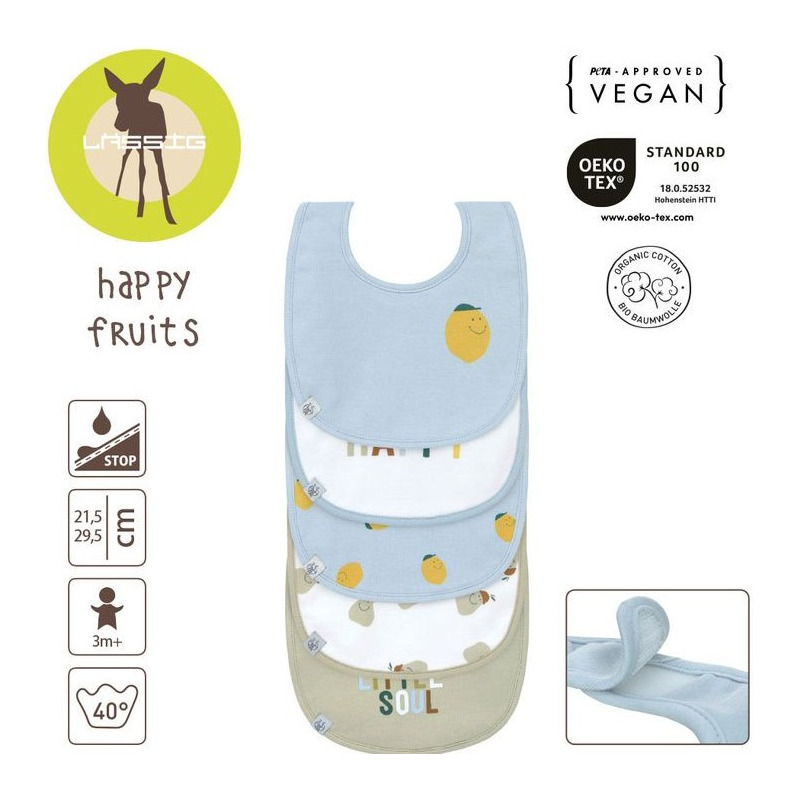 Zestaw pięciu miękkich, bawełnianych śliniaków marki LASSIG. Każdy inny: dwa jasnoniebieskie z motywem uśmiechniętej cytrynki, szary z napisem HAPPY LITTLE SOUL, biały z motywem uśmiechniętej gruszki oraz biały z kolorowym napisem HAPPY. Wodoodporne, bezpieczne, przydatne przy karmieniu oraz pierwszych samodzielnych posiłkach. Zapięcie na rzep zapewnia komfort użytkowania.