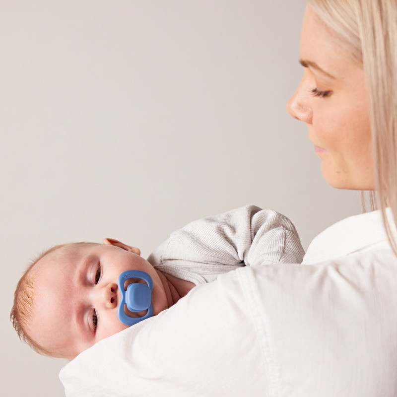 Zadbaj o spokój Twojego Maluszka z symetrycznym smoczkiem w odcieniach niebieskiego.