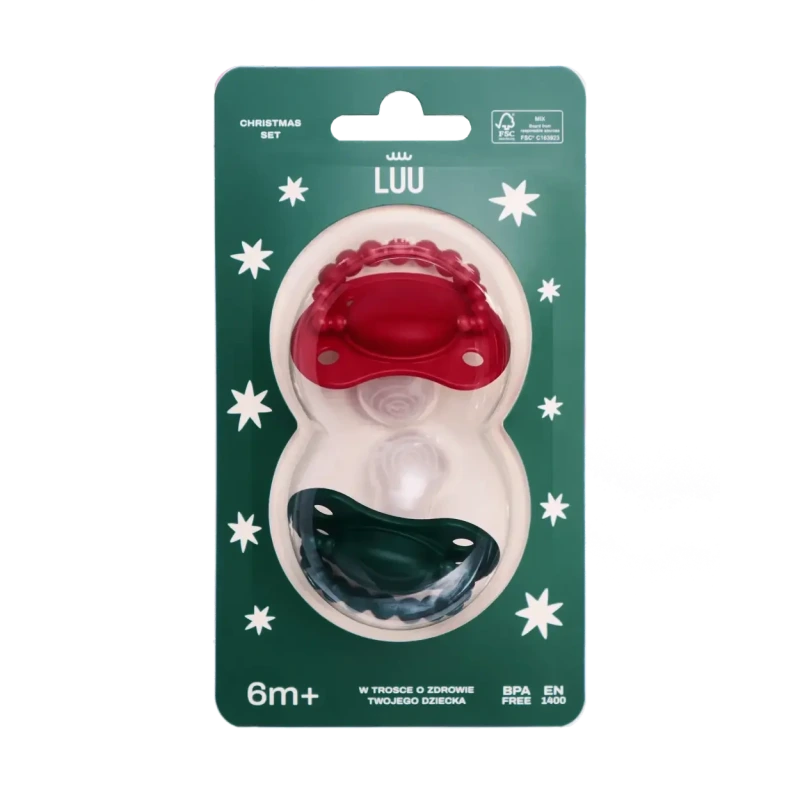 Wyjątkowy świąteczny zestaw smoczków w kolorach Holly Green i Santa Red.