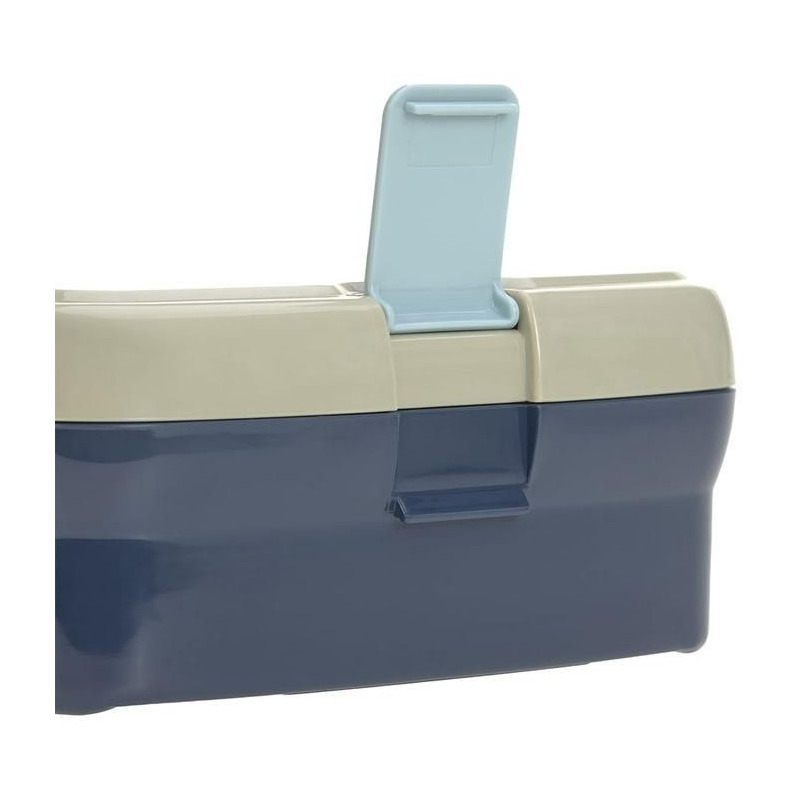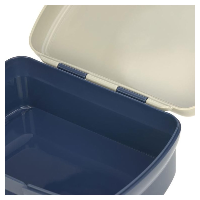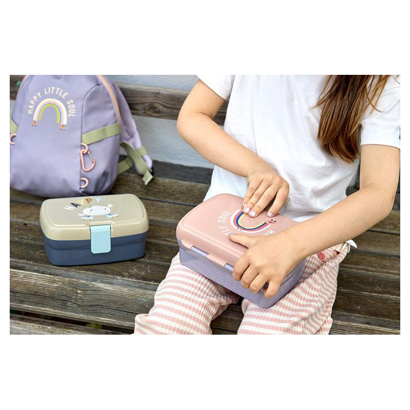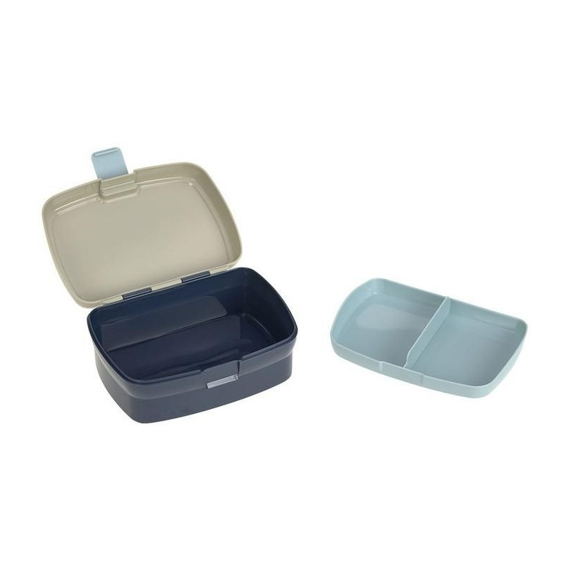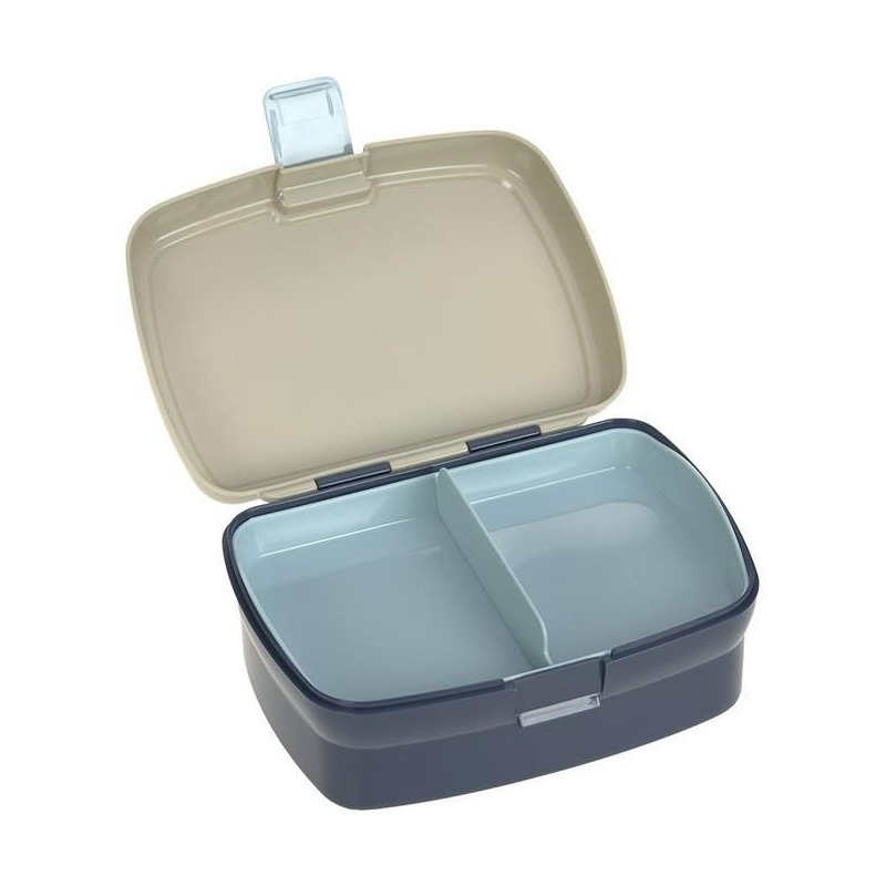Pudełko śniadaniowe z kolekcji Tiny Outdoor marki LASSIG idealne do przedszkola lub szkoły, podczas podróży, spacerów i wycieczek. Jest pojemne i sprytnie podzielone na część główną (na dole), która pomieści np. kanapki oraz wyjmowaną, dwudzielną wkładkę na przekąski, np. pokrojone owoce czy wafelki, którą można umieścić w górnej przestrzeni. Dwupoziomowy lunchbox jest szczelny i solidny, wygodny do zamykania i otwieranie za pomocą szerokiego klipsa z przodu. Ma ergonomiczny kształt i mieści się nawet do małego plecaka. Pojemnik jest w kolorach granatowym i khaki. Na wieczku znajduje się napis HAPPY i zabawna grafika z chmurką na wrotkach.