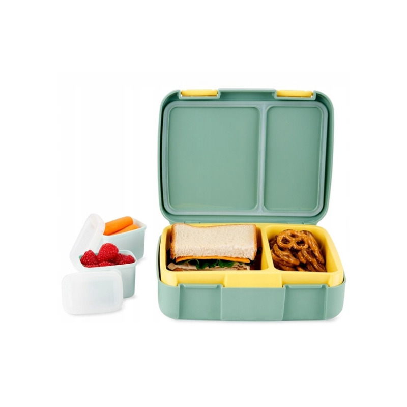tacce oraz w osobnych pojemnikach z pokrywami. Bezpieczne zamknięcie zapobiega powstawaniu bałaganu wewnątrz pudełka na śniadanie, a przyjazne dla dzieci zatrzaski są łatwe do otwierania i zamykania przez małe rączki. A to nie wszystko! Pojemnik Bento można myć w zmywarce, więc jego czyszczenie jest dziecinnie proste.