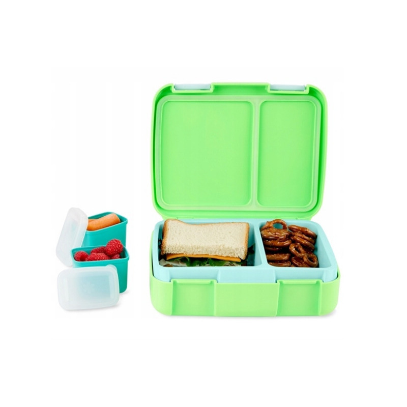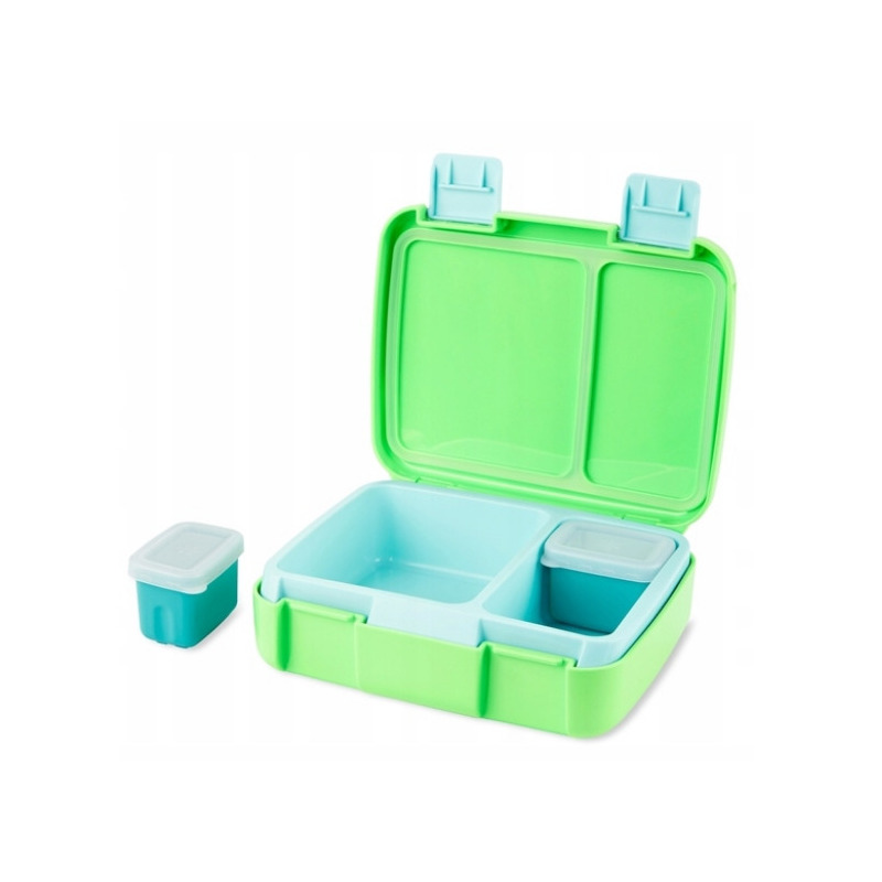 tacce oraz w osobnych pojemnikach z pokrywami. Bezpieczne zamknięcie zapobiega powstawaniu bałaganu wewnątrz pudełka na śniadanie, a przyjazne dla dzieci zatrzaski są łatwe do otwierania i zamykania przez małe rączki. A to nie wszystko! Pojemnik Bento można myć w zmywarce, więc jego czyszczenie jest dziecinnie proste.
