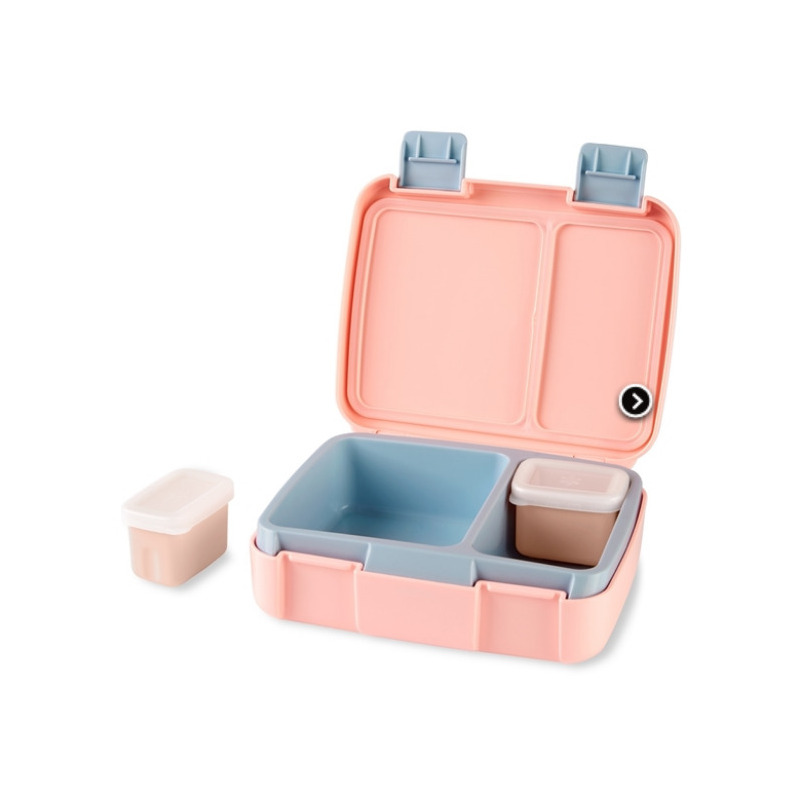tacce oraz w osobnych pojemnikach z pokrywami. Bezpieczne zamknięcie zapobiega powstawaniu bałaganu wewnątrz pudełka na śniadanie, a przyjazne dla dzieci zatrzaski są łatwe do otwierania i zamykania przez małe rączki. A to nie wszystko! Pojemnik Bento można myć w zmywarce, więc jego czyszczenie jest dziecinnie proste.