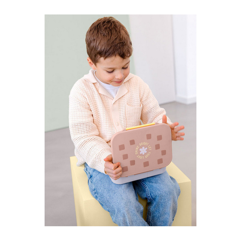 Lunchbox ma kolor rówowo-liliowy z grafiką białego kwiatka i napisem LET YOUR LIGHT SHINE BRIGHT oraz jasno żółty klips.