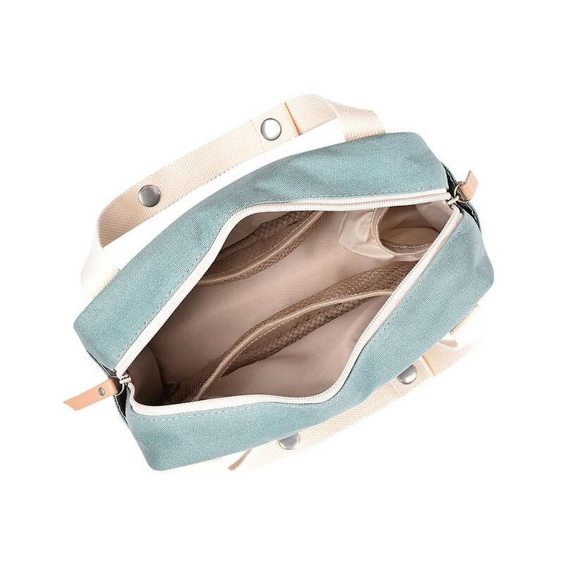oryginalnej kolorystyce: ma pastelowy szałwiowo-zielony kolor, jasną podszewkę, paski, rączki i suwaki w odcieniu offwhite oraz detale z jasnobeżowej ekoskóry.
