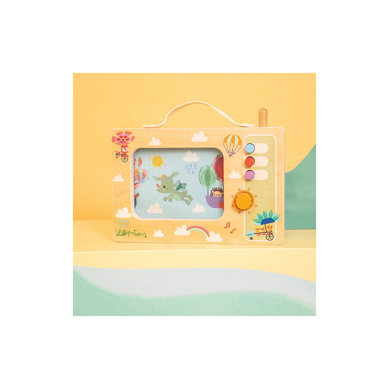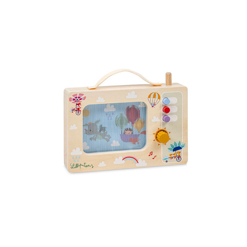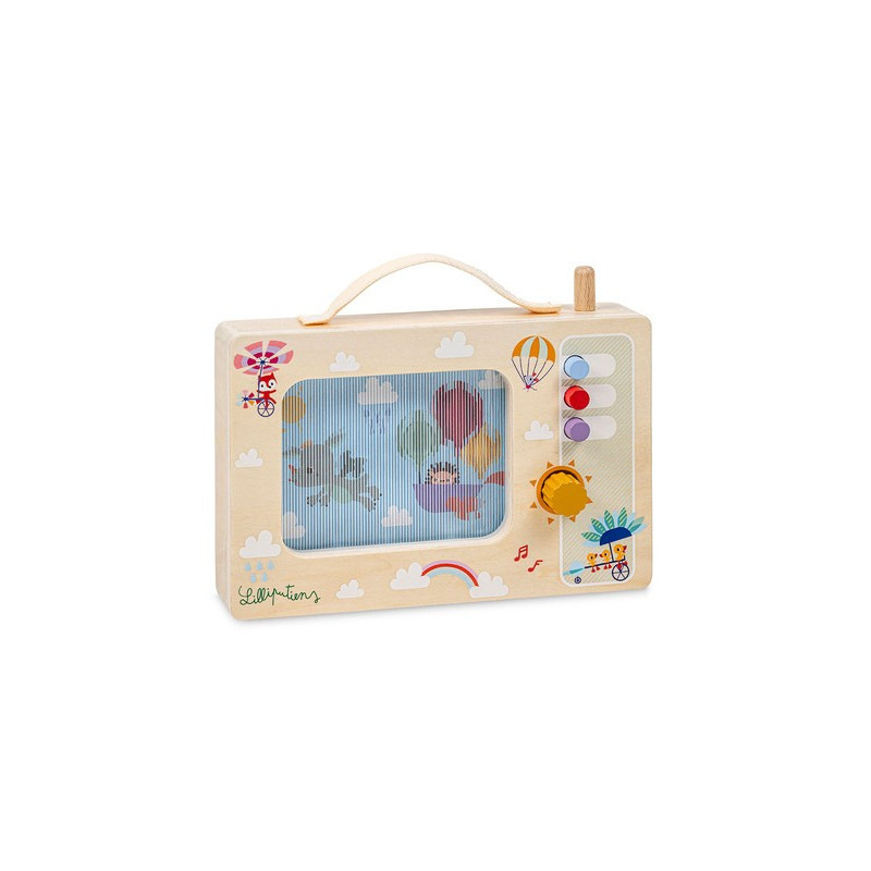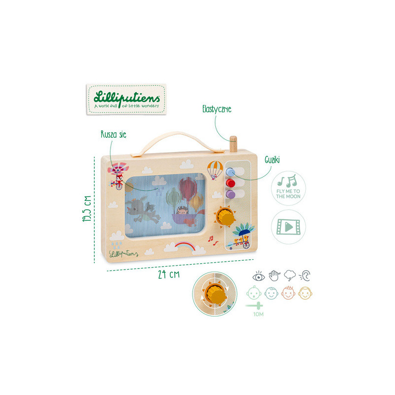 Drewniana pozytywka w kształcie telewizora to wielofunkcyjne źródło rozrywki i nauki dla Maluszków. Zabawka posiada wiele funkcji: ekran z ruchomymi postaciami muzykujących zwierząt, m.in. m.in. smoka, lisiczki czy jeżyka, panel z pokrętłem do nakręcania pozytywki i guziczkami, antenkę czy uchwyt do wygodnego przenoszenia. Odtwarza przyjemną jazzową melodię „Fly me to the moon”. Pozytywka aktywizuje zmysł słuchu (muzyka) i wzroku (animacja).