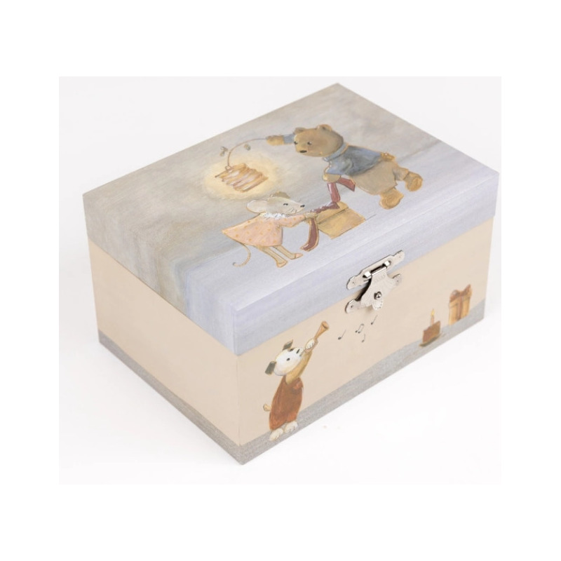 Szkatułkę z zewnątrz zdobi motyw uroczych zwierzątek: niedźwiadka, myszki i pieska.