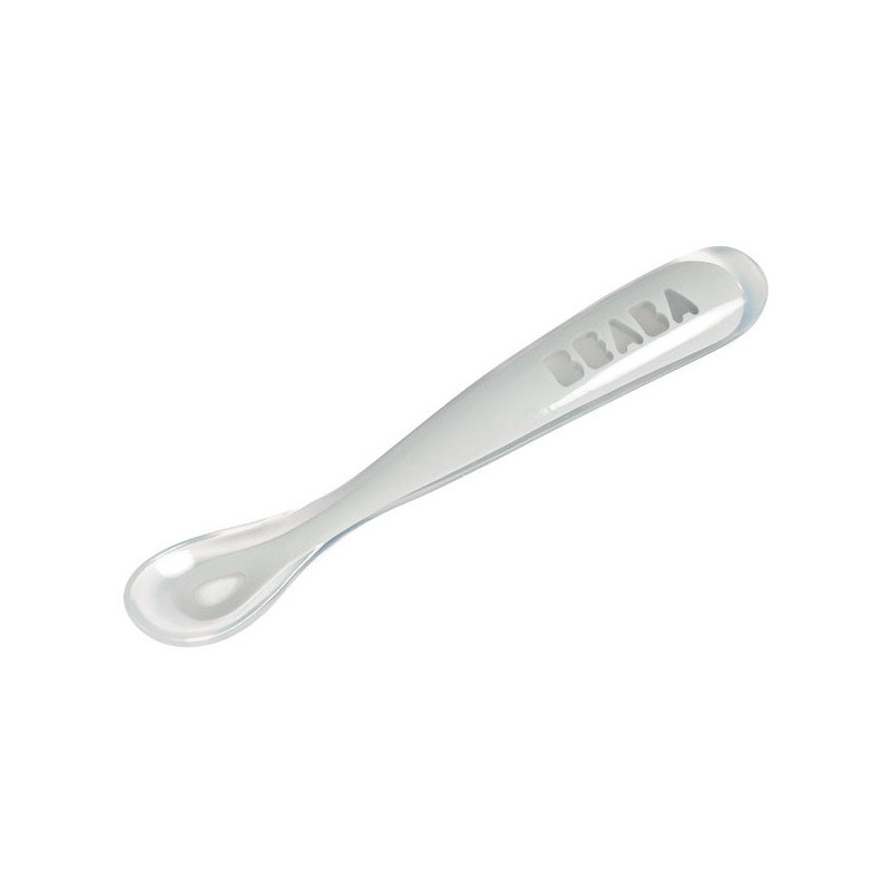 Szara łyżeczka silikonowa przeznaczona do samodzielnego jedzenia.