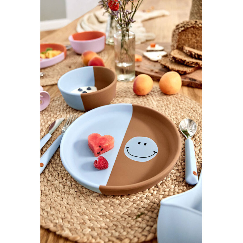 Sztućce są lekkie i mają specjalnie profilowane kształty, co ułatwia dzieciom nabieranie pożywienia. Jasnoniebieska rękojeść z silikonu z karmelową grafiką uśmiechniętej buźki została zaprojektowana tak, by idealnie pasować do dziecięcej rączki. Jej ergonomiczny kształt sprawia, że łatwo ją złapać i utrzymać, co wspiera rozwój samodzielności malucha.