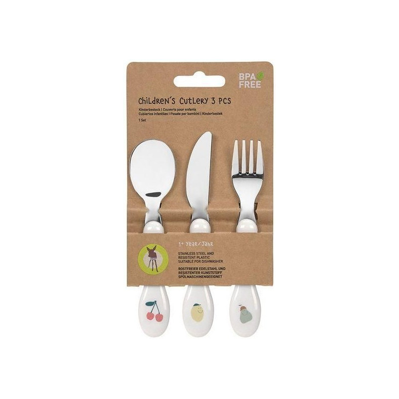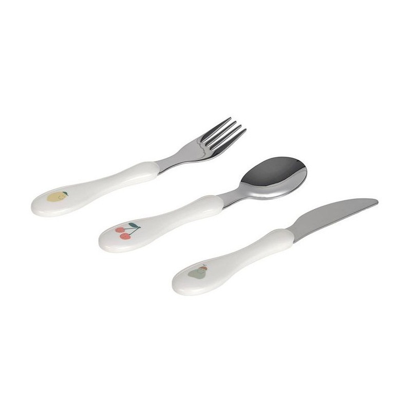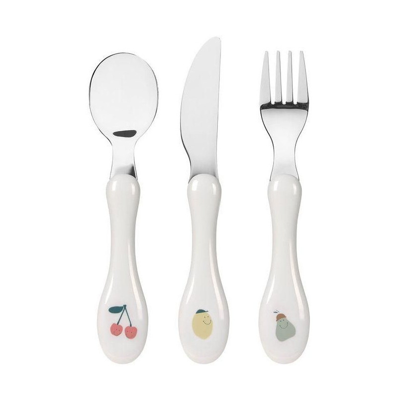 Komplet sztućców ze stali nierdzewnej marki składa się z widelca, łyżki i noża. Sztućce są lekkie i mają specjalnie profilowane kształty, co ułatwia dzieciom nabieranie pożywienia. Biała rękojeść z tworzywa – z motywem uśmiechniętych wisienek na łyżce, cytrynki na nożu i gruszki na widelczyku – również została zaprojektowana tak, by idealnie pasować do dziecięcej rączki. Dzięki przewężeniu łatwo ją złapać i utrzymać.