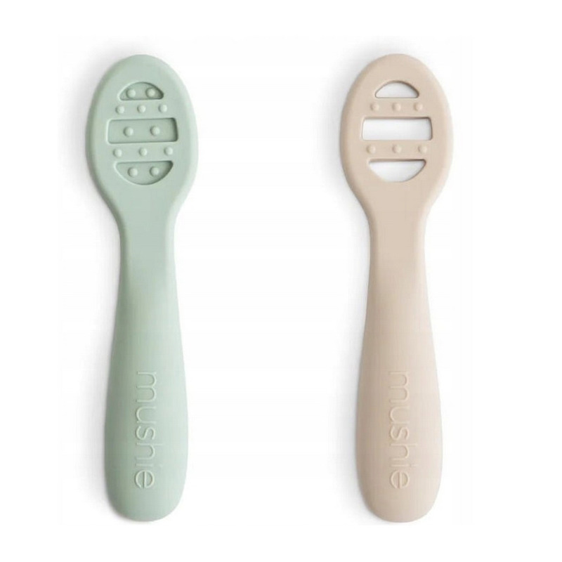 Pierwsze łyżeczki dla niemowląt do nauki jedzenia 2-pack Cambridge Blue/Shifting Sand Mushie 6m+