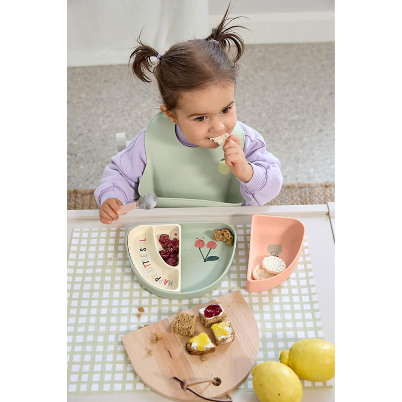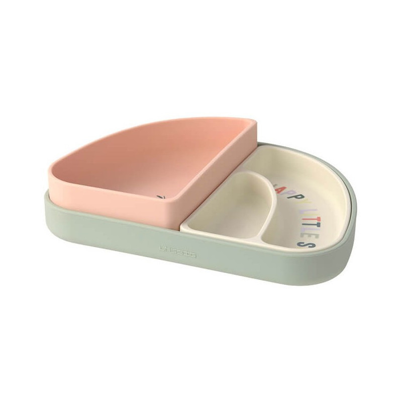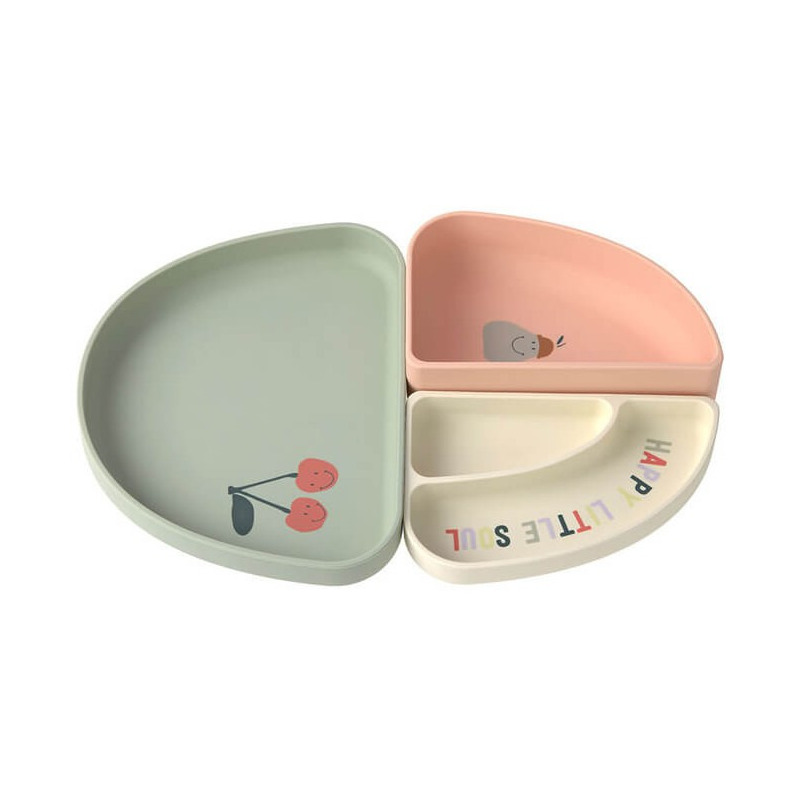 Zestaw silikonowych naczyń marki LASSIG to idealny wybór dla maluchów, które uczą się samodzielnego jedzenia. W skład zestawu wchodzi spory talerz w kształcie tęczy oraz dwie miseczki: wyższa i niższa (dwudzielna), które doskonale pasują do siebie i mieszczą się w talerzu. Naczynia mają estetyczny i atrakcyjny dla malucha wygląd: talerz w kształcie tęczy jest pastelowo zielony z motywem uśmiechniętych wisienek na spodzie, miski (połówki tęczy) zaś: różowa z motywem gruszki i kremowa z kolorowym napisem HAPPY LITTLE SOUL.