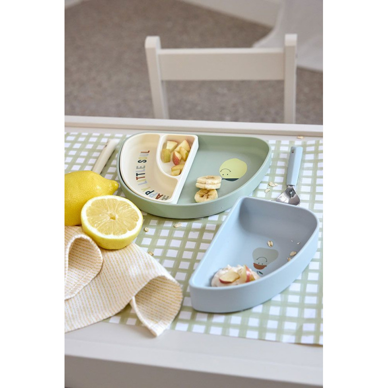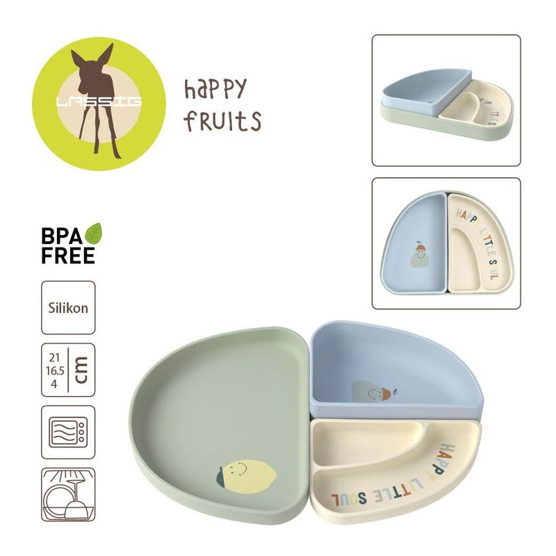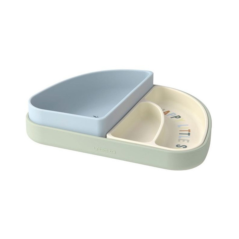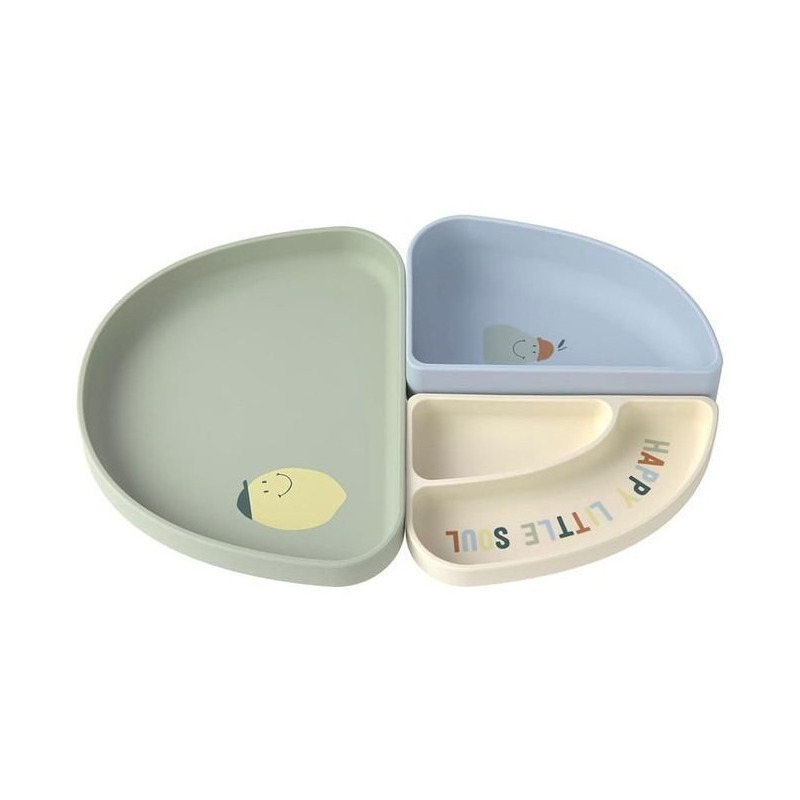 Komplet silikonowych naczyń marki LASSIG. W jego skład wchodzi spory talerz oraz dwie (mieszczące się w nim) miseczki: wyższa i niższa– dwudzielna, idealna np. na przekąski. Naczynia mają estetyczny i atrakcyjny dla malucha wygląd: talerz w kształcie tęczy jest pastelowo zielony z motywem uśmiechniętej cytrynki na spodzie, miski (połówki tęczy) zaś: jasnoniebieska z motywem gruszki i kremowa z kolorowym napisem HAPPY LITTLE SOUL.