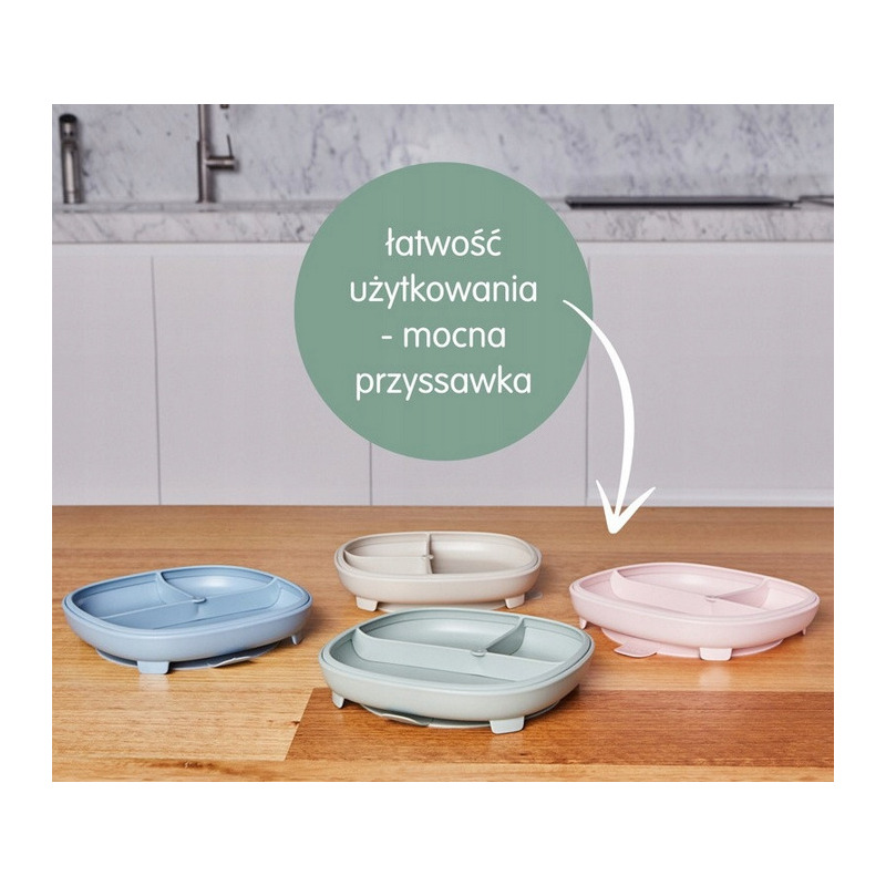 - łatwość użytkowania: mocna przyssawka zapewnia stabilność na gładkiej powierzchni, a zaokrąglone brzegi ułatwiają samodzielne jedzenie