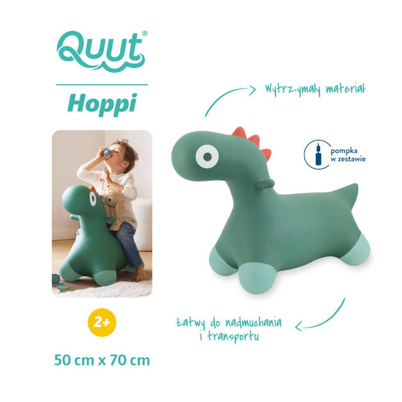 Oryginalny, sporych rozmiarów dmuchany skoczek Hoppi Dino w kolorze zielonym to świetna i rozwojowa rozrywka dla aktywnych Maluchów.