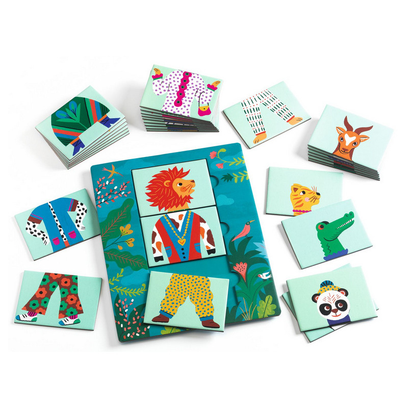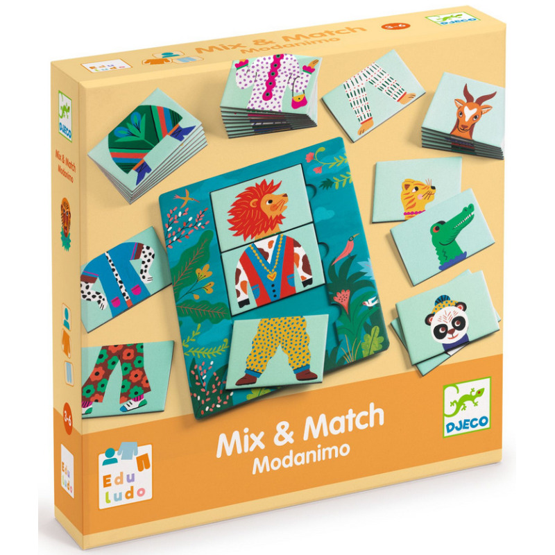 Zabawne zwierzątka urządziły sobie bal przebierańców! Lew chce założyć czerwoną kamizelkę i żółte spodnie w kropki, a krokodyl granatowy garnitur! Układanka Mix & Match Modanimo to prawdziwa rewia mody wśród zwierząt. Specjalna plansza posiada trzy wgłębienia, w których należy umieścić trzy karty odpowiadające częściom ciała: głowa wybranego zwierzątka, tułów i nogi. Niezliczona ilość kombinacji pozwala stworzyć unikatowe stylizacje dla tych uroczych stworzeń!