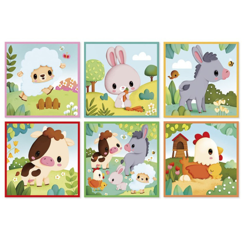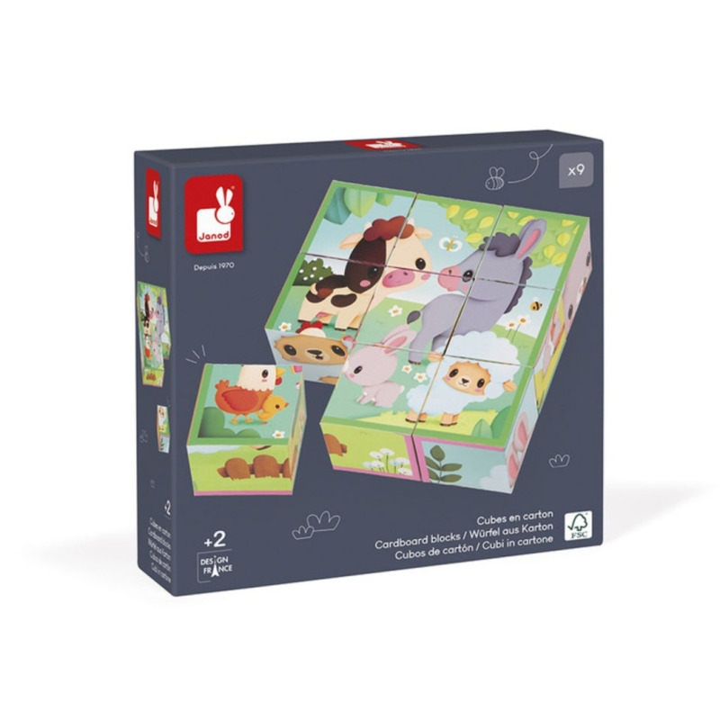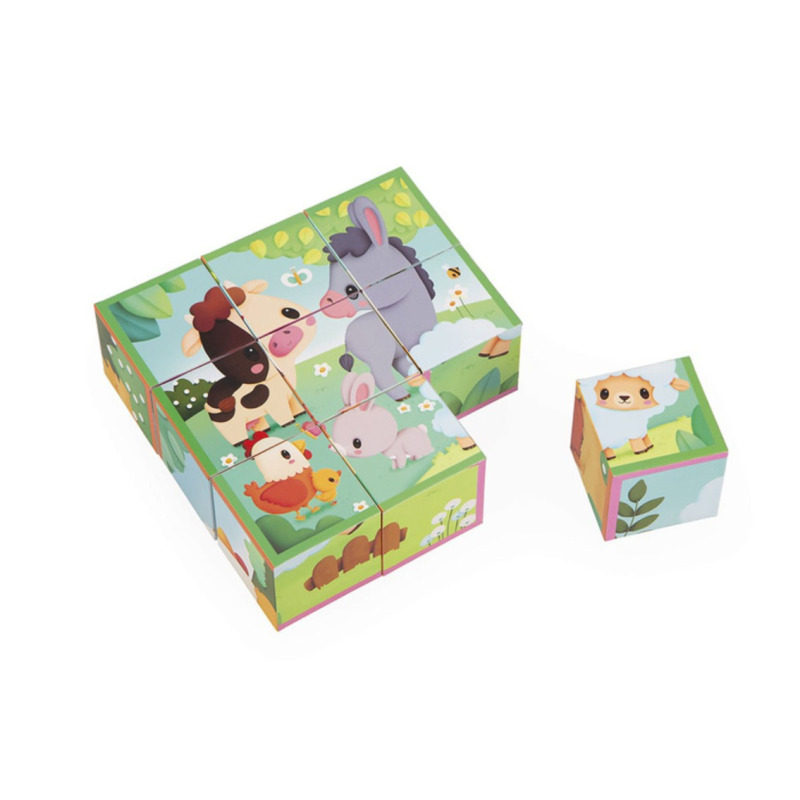 Klocki-układanka z kolekcji Farma francuskiej marki JANOD składaja się z 9 sześciennych elementów, które po ułożeniu mogą stworzyć aż 6 różnych obrazków, przedstawiających zwierzątka na farmie, m.in. owieczkę, osiołka, czy krówkę. To doskonała układanka dla małych dzieci na rozpoczęcie przygody z puzzlami.