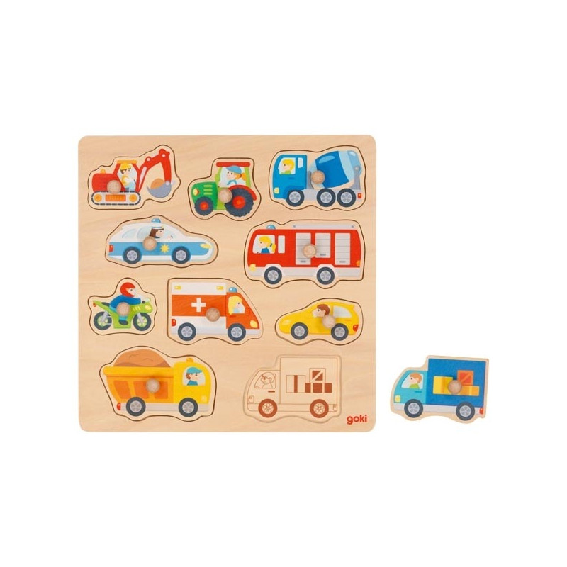 Drewniana układanka z uchwytami przedstawiająca pojazdy