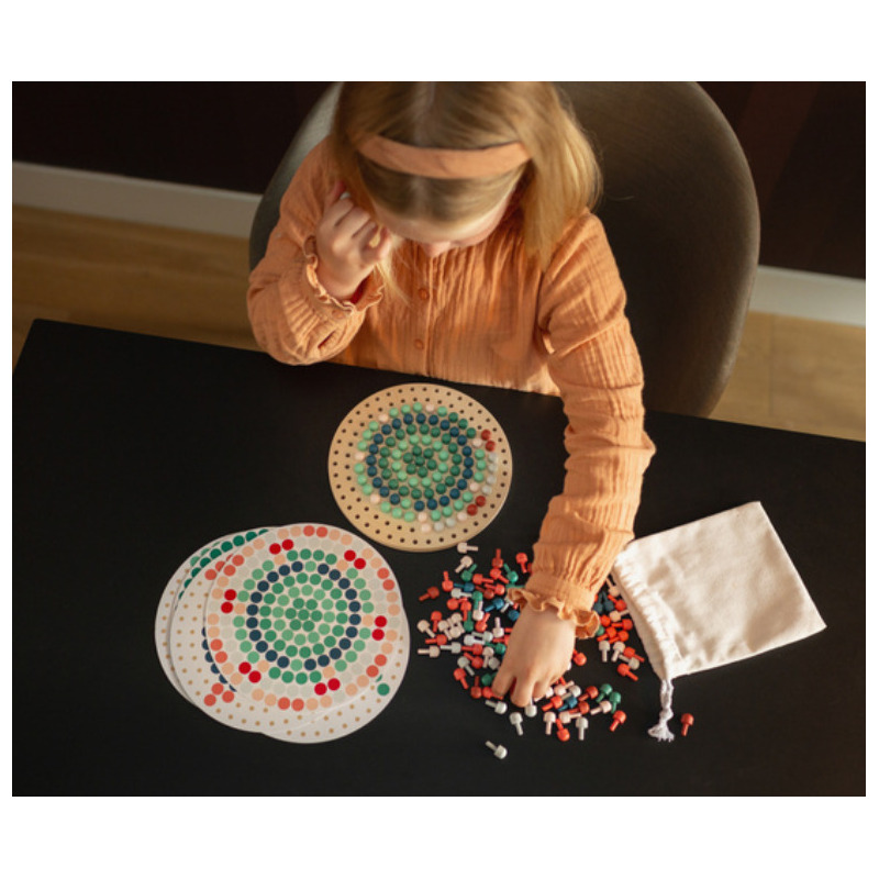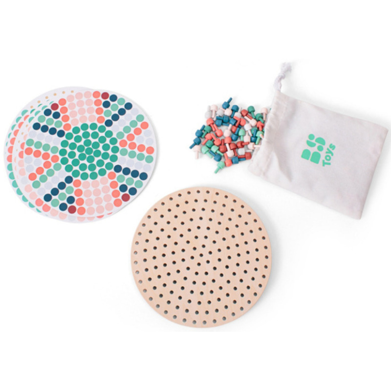 1 x drewniana deska z otworkami o średnicy 19 cm, 217 drewnianych pinezek 1x2 cm, 6 kart z 12 wzorami, bawełniany woreczek do przechowywania