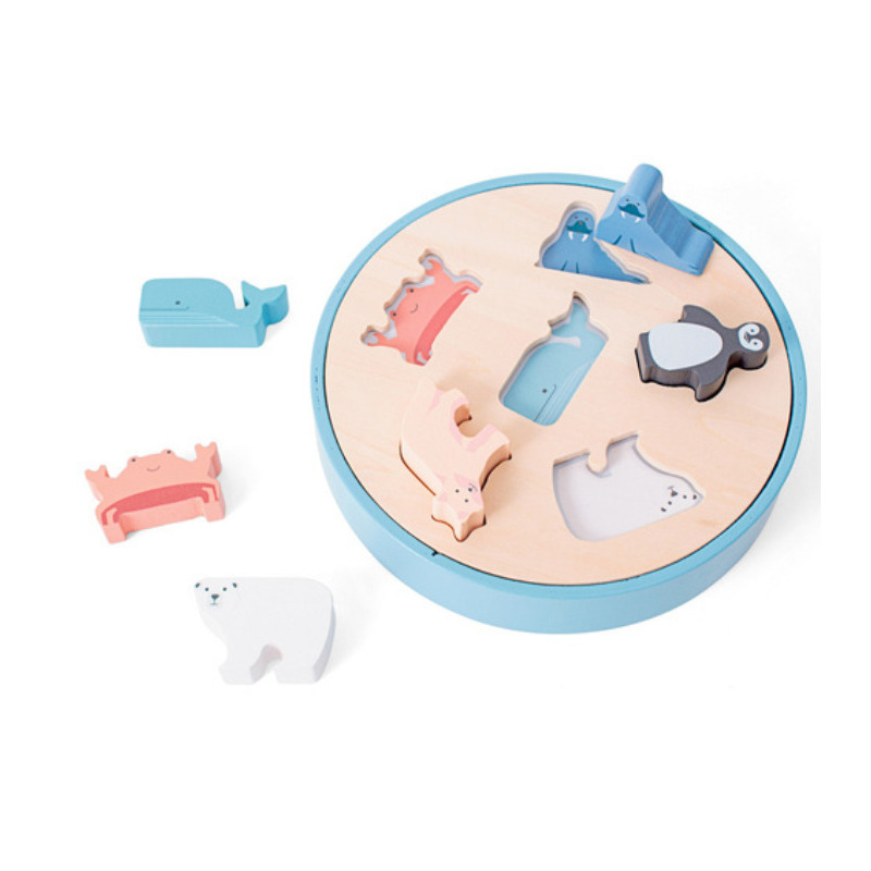 Drewniany sorter Zwierzęta Arktyki to wspaniała zabawa w dopasowywanie zwierzątek do odpowiednich otworów. Super zabawa i ćwiczenie dla najmłodszych wielbicieli układanek i puzzli. Dziecko ma za zadanie dopasować w odpowiednie otworki zwierzątka: fokę, białego niedźwiedzia, kraba, pingwinka, liska i orkę.