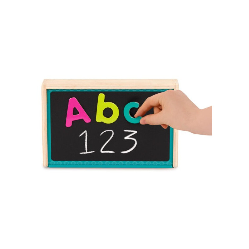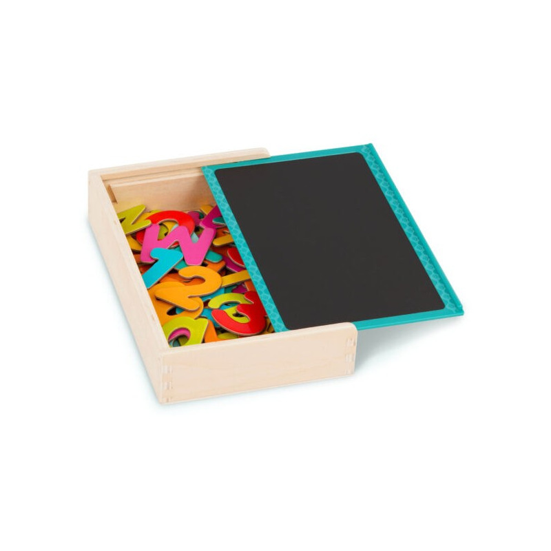 MAGNETYCZNE LITERKI I CYFERKI w drewnianej skrzyneczce, z TABLICĄ do pisania kredą B.TOYS 3+