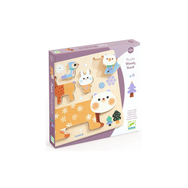 Niedźwiadek, łoś, ptaszek i inne zwierzątka zapraszają do zabawy na śniegu! Puzzle przestrzenne to duże elementy w kształcie zwierzątek, które można dopasować do drewnianej podstawki lub ustawić w wieżę. Puzzle są zaprojektowane tak, aby zwierzątka mogły samodzielnie stać, nie przewracając się.