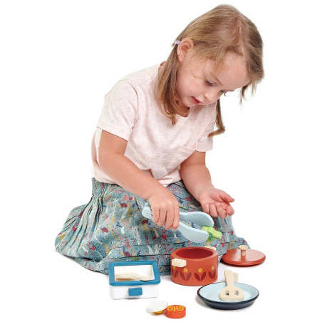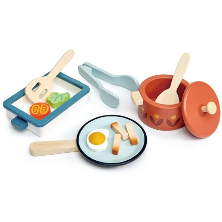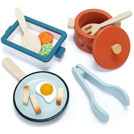 Zestaw idealnie pasuje do drewnianej kuchni Tender Leaf Toys!