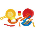 miskę do mieszania, durszlak, patelnię, dwa talerze, trzepaczkę, sztućce, solniczkę