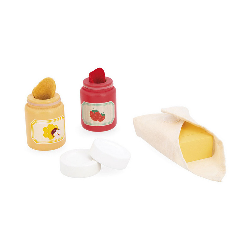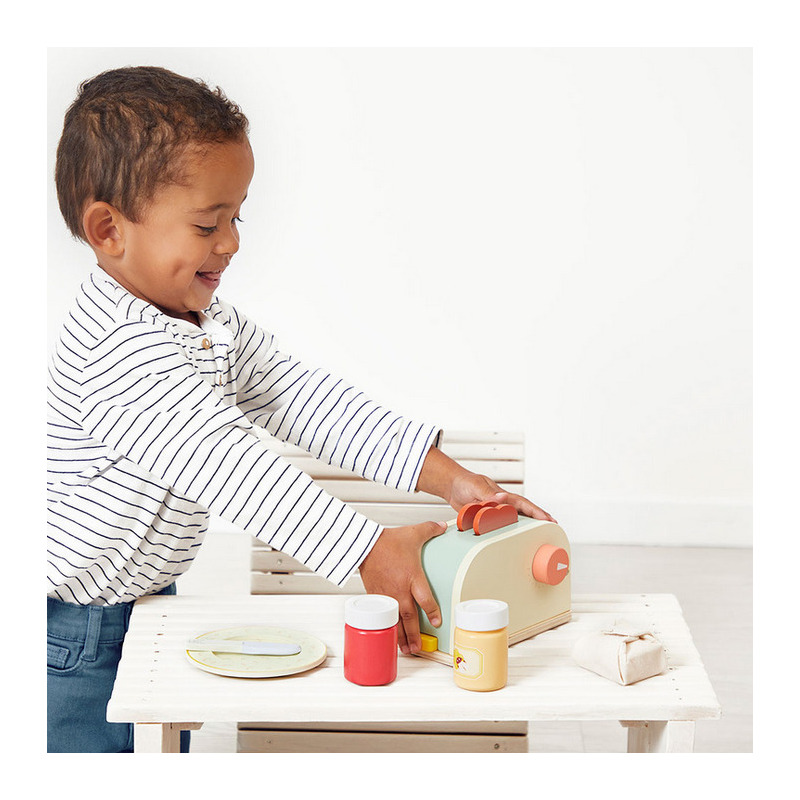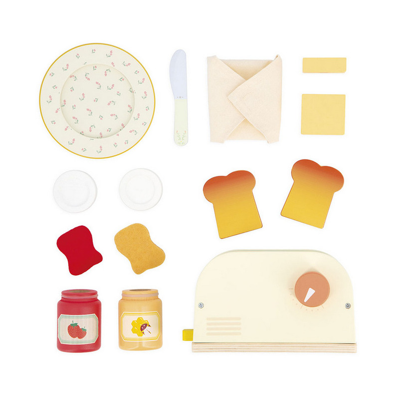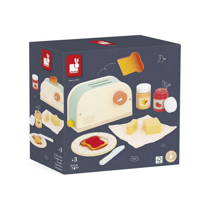 Drewniany zestaw śniadaniowy z kolekcji Shiny Grandma francuskiej marki JANOD sprawi mnóstwo radości każdemu dziecku. Sprawdzi się zarówno jako samodzielna zabawka, jak i uzupełnienie każdej dziecięcej kuchni, inspirując do kreatywnej zabawy w gotowanie. Zestaw zawiera drewniany toster z guziczkiem i pokrętłem oraz 12 akcesoriów.