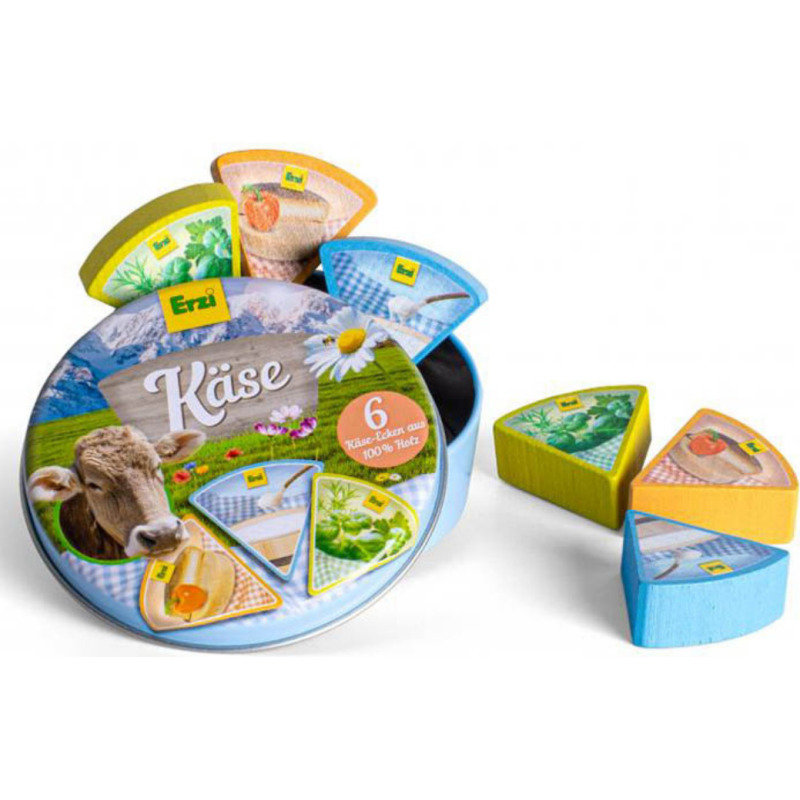 Drewniany ser topiony w trójkątach Erzi powstał z myślą o zabawie w sklep lub gotowanie. Niezwykle realistycznie wyglądające trójkąciki serka topionego w różnych smakach zapakowane są w okrągłe opakowanie z kolorową grafiką. Elementy wykonane zostały z solidnego drewna buku.