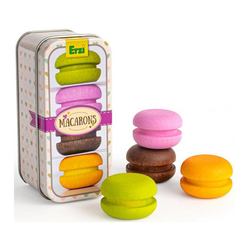 Drewniane makaroniki to realistycznie wyglądające ciasteczka do zabawy w kawiarnię, sklep lub pieczenie słodkości. Metalowe opakowanie skrywa cztery makaroniki wykonane z drewna buku. W zależności od koloru makaroniki mają różne smaki, dzięki czemu klienci cukierni będą mogli wybrać swój ulubiony.