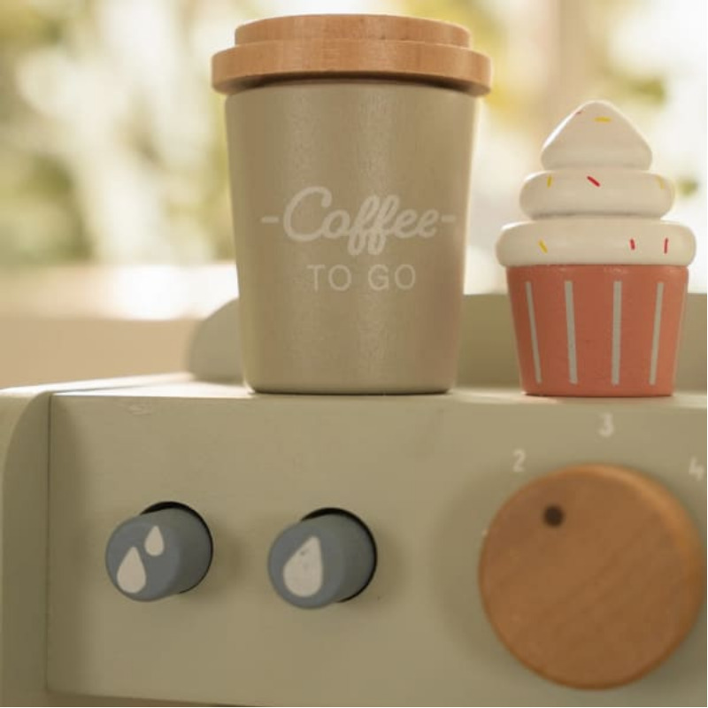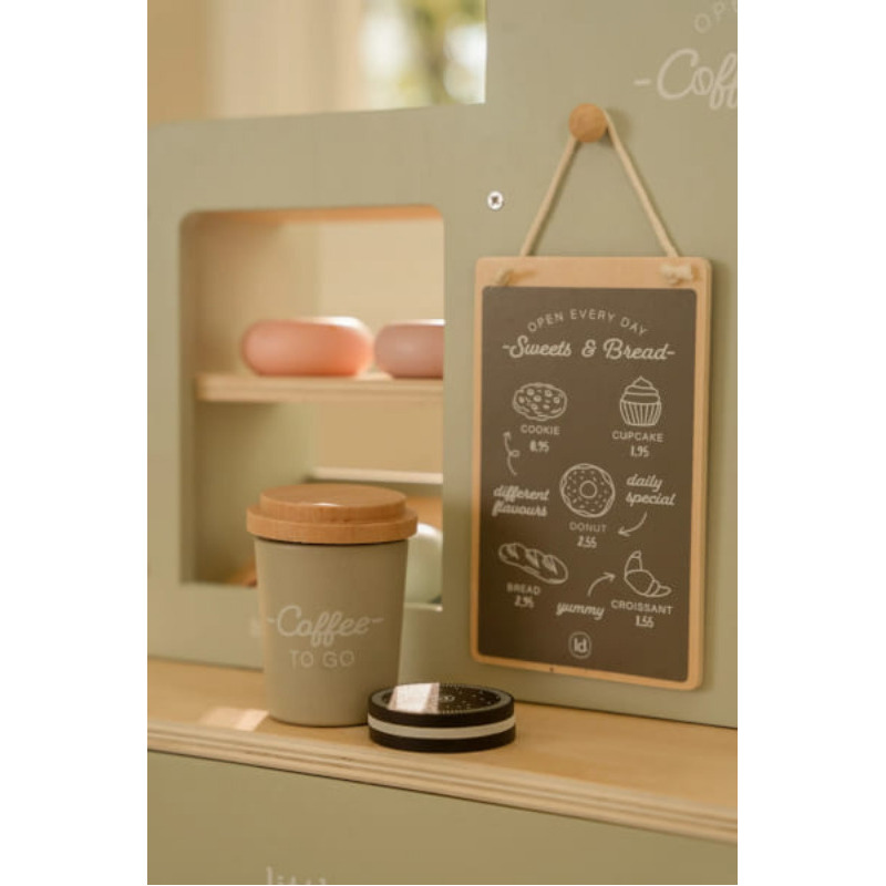 Dzięki drewnianej kawiarence Twoje dziecko zamieni się w prawdziwego baristę. Z tym uroczym zestawem Ty i Twoje dziecko możecie mieć Waszą ulubioną kawiarnię w swoim domu. Twoje dziecko z przyjemnością przygotuje pyszne napoje i ciasteczka na miejscu i na wynos. W kąciku kawowym znajduje się ekspres do kawy i herbaty, schowek na wszystkie kubki i inne niezbędne artykuły, witryna na przekąski oraz tablica z menu. Liczne akcesoria, takie jak rogaliki, pączki, torebki z herbatą i naboje z różnymi rodzajami kawy zapewnią wiele godzin cudownej zabawy.
