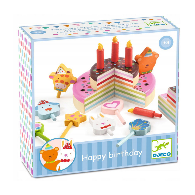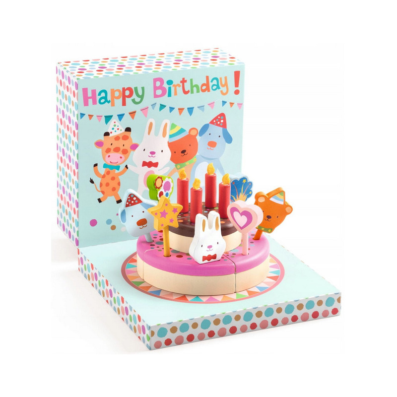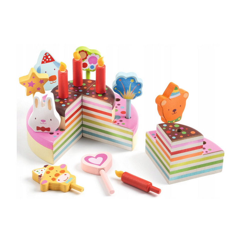 Uroczo zdobione drewniane pudełko skrywa kolorowy tort, który można ozdobić załączonymi akcesoriami w kształcie zwierzątek, gwiazdek lub serduszek oraz świeczkami. W środku po "odkrojeniu" kawałka ukazują się warstwy biszkoptu i kremu w kolorach tęczy. Pudełko może służyć jako podstawka udająca talerz. Wszystkie akcesoria można w nim przechowywać, więc po skończonej zabawie łatwo zapanować nad porządkiem.