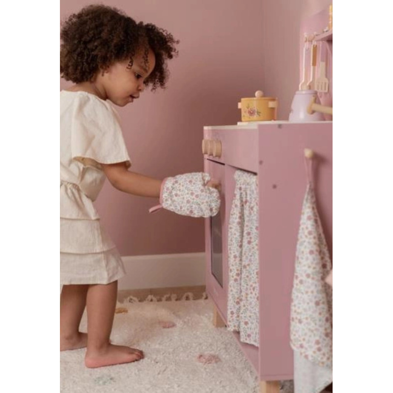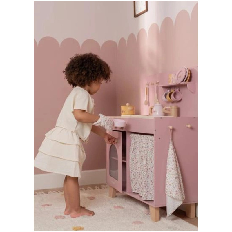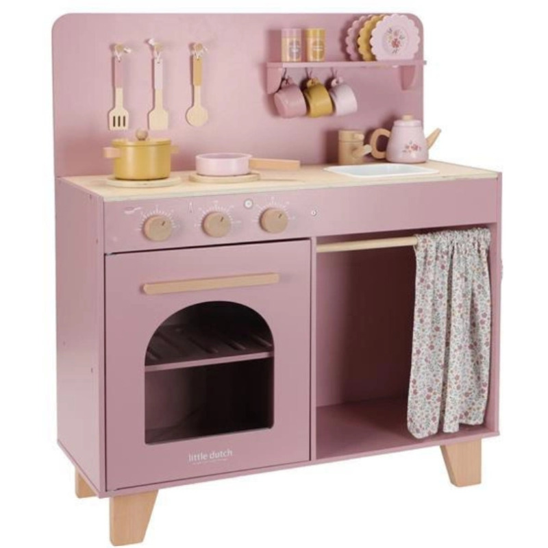 Duża kuchnia pastelowa Little Dutch jest pięknie wykończona z dbałością o najdrobniejszy szczegół, utrzymana jest w pastelowej kolorystyce z przewagą pięknego, różowego koloru. W tej kuchni znajdziecie zamykany piekarnik, płytę grzewczą, zlew oraz całe mnóstwo półek do przechowywania zabawkowych naczyń. W skład zestawu wchodzą również: talerzyki, garnek z przykrywką, patelnia, solniczka i pieprzniczka oraz zestaw łyżek i szpatułek drewnianych.