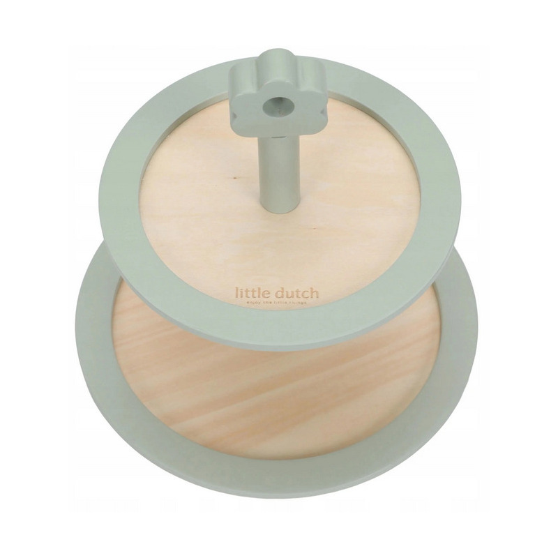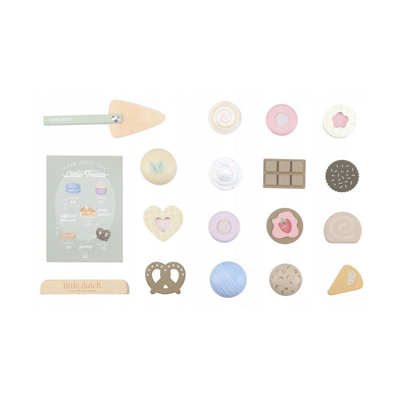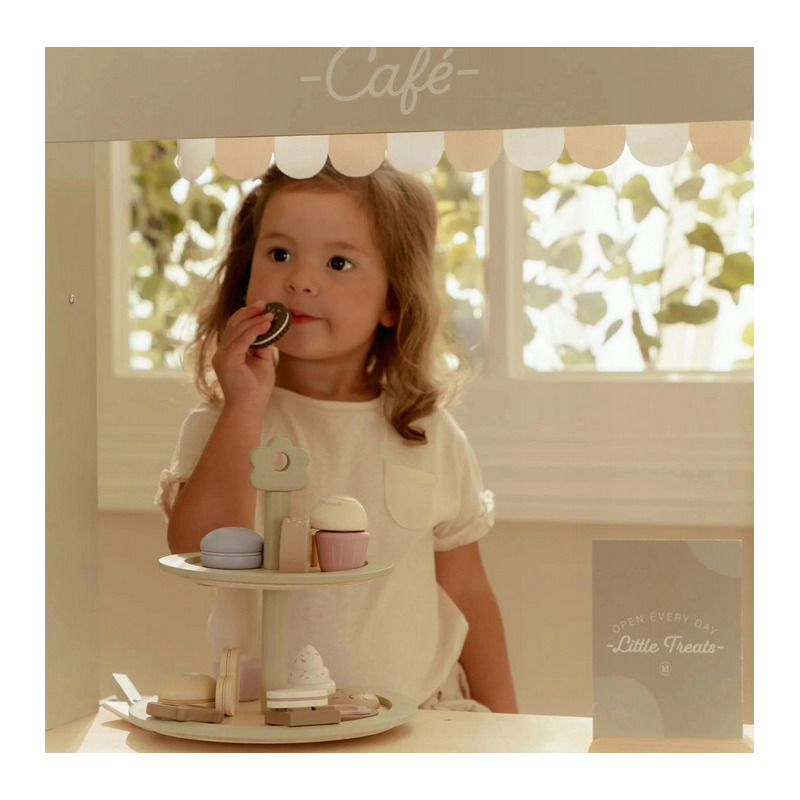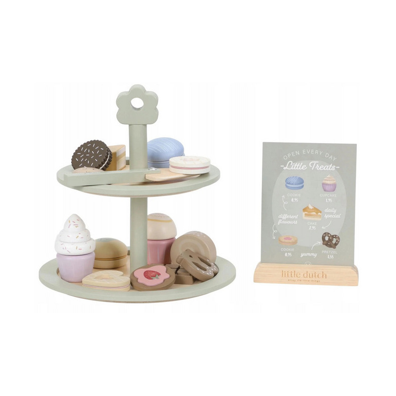 Piękny, drewniany, piętrowy stojak pełen pysznych wypieków. Na dwóch poziomach znajdziesz m.in. muffinkę, ciasteczka i kolorowe makaroniki – wszystkie równie pyszne. Dziecko może użyć dołączonej łopatki do ciasta i karty menu z ilustracjami, aby pozwolić gościom wybrać deser. Idealne do kreatywnej zabawy i przytulnych chwil przy popołudniowej herbacie!