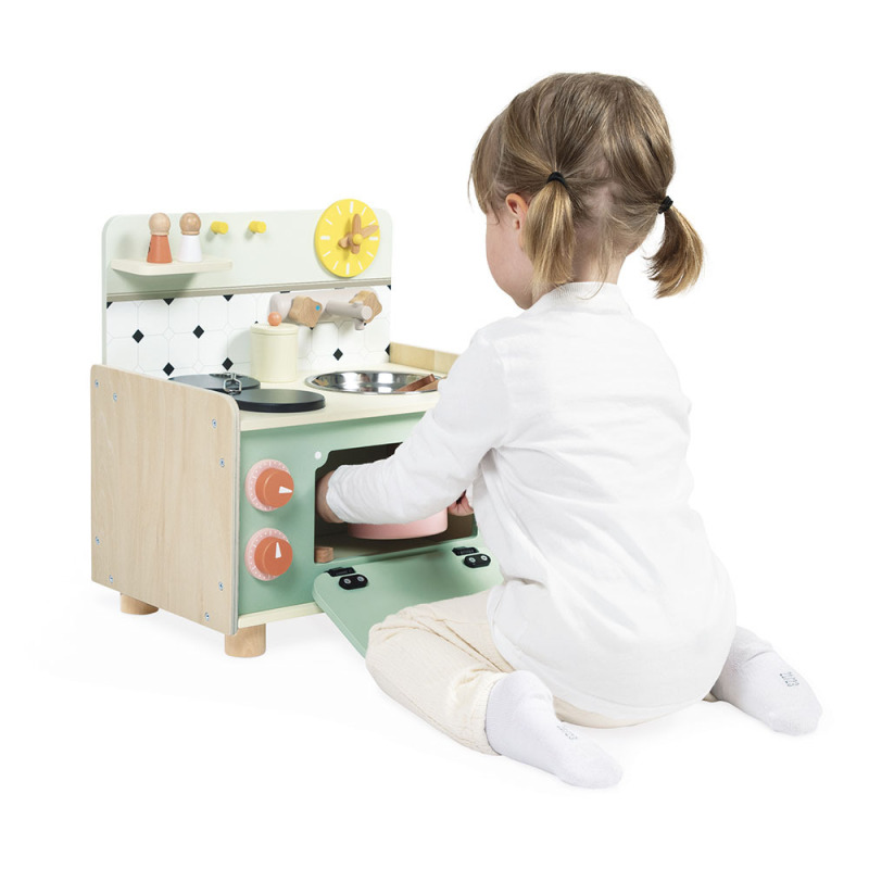 Mała drewniana kuchnia z kolekcji Shiny Grandma francuskiej marki JANOD sprawi mnóstwo radości każdemu dziecku. Pozwoli bezpiecznie uczestniczyć w codziennych czynnościach i rozwijać pasję gotowania. Urocza miętowa kuchnia na niewysokich nóżkach posiada: okrągły, metalowy zlew, dwa palniki, piekarnik z magnetycznym zamknięciem, niedużą górną półeczkę z zegarem i boczny reling na ściereczkę.