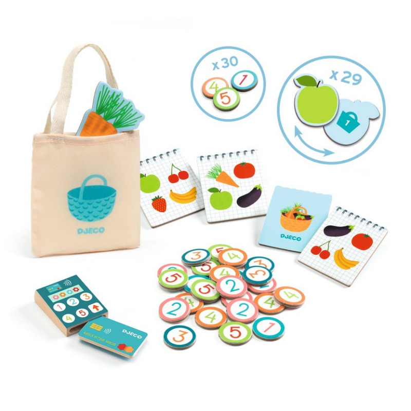Mały ryneczek Lei i Milo zaprasza do wspólnej zabawy! Każda uczestnik będzie mieć swoją określoną rolę. Sprzedawca układa towar na półkach, waży warzywa, obsługuje kasę i wydaje paragony. Klient robi zakupy wedle uznania lub bazując na gotowych listach dołączonych do zestawu. Następnie płaci przy kasie kartą lub gotówką. Drewniany stoliczek do samodzielnego złożenia pomieści wszystkie akcesoria zawarte w zestawie takie jak: kartonowe karty w kształcie owoców i warzyw z cenami na odwrocie, listy zakupowe, monety, terminal płatniczy itp. Drewniana waga pozwoli na ważenie zakupów "na niby". Wszystkie zakupy można spakować do płóciennej minitorby.