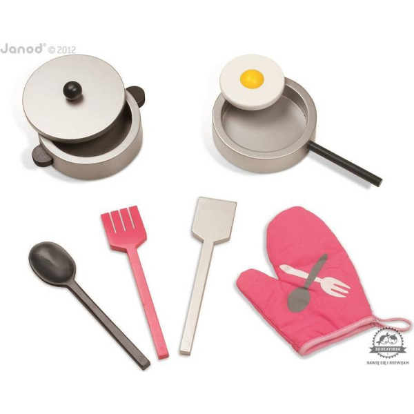- akcesoria: trzy drewniane łyżki, garnek z pokrywką,
