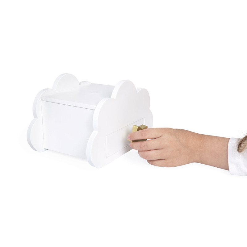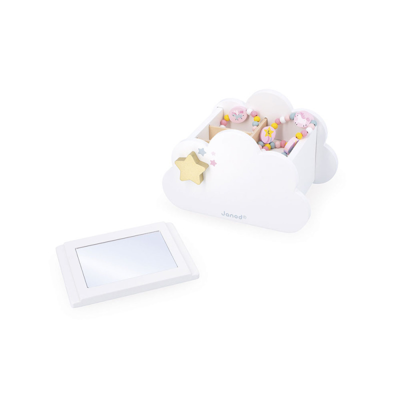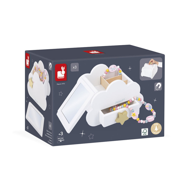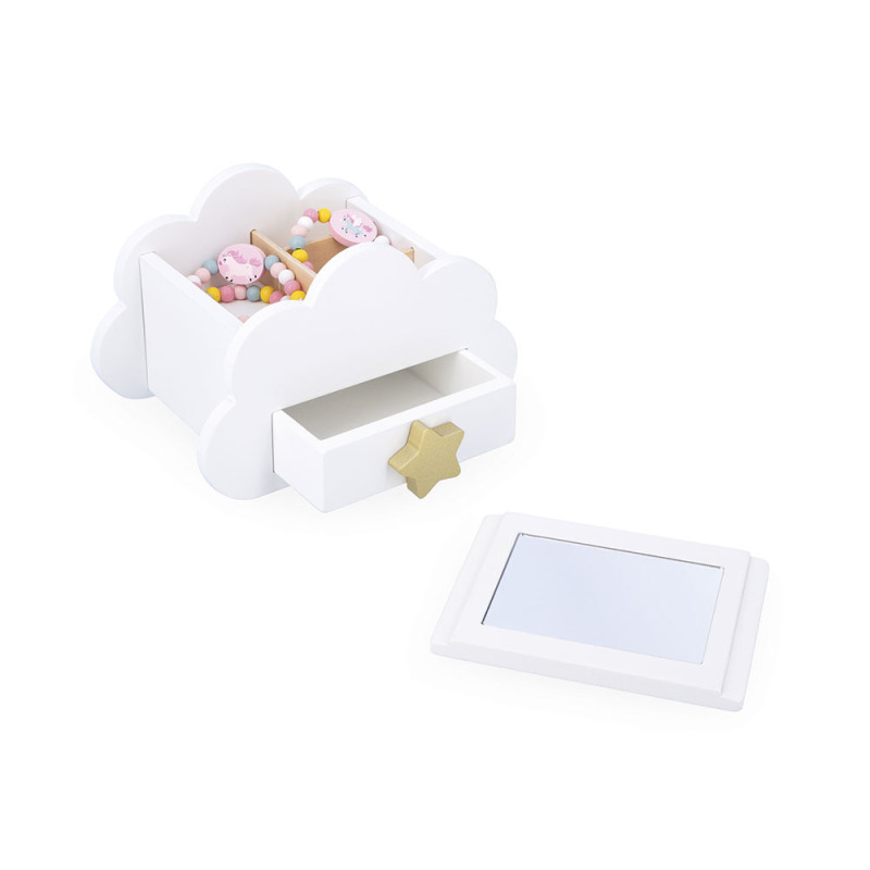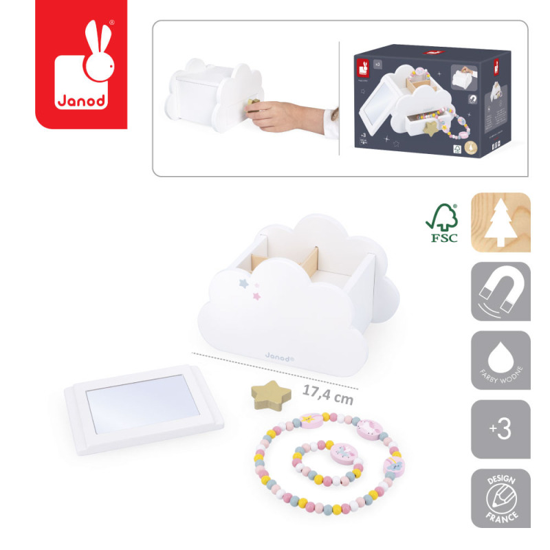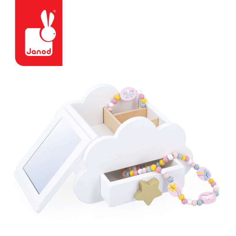 Szkatułka na biżuterię z motywem przewodnim jednorożca francuskiej marki JANOD to doskonała zabawka dla małej modnisi. Zestaw składa się z białej, drewnianej szkatułki w kształcie chmurki z ukrytą szufladką, przegródkami i pokrywką z lusterkiem. Dodatkowo w komplecie znajduje się magnes-gwiazdka, który umożliwia otwarcie szufladki, a także komplet biżuterii – naszyjnik i bransoletka wykonane z kolorowych, drewnianych koralików.