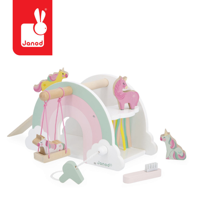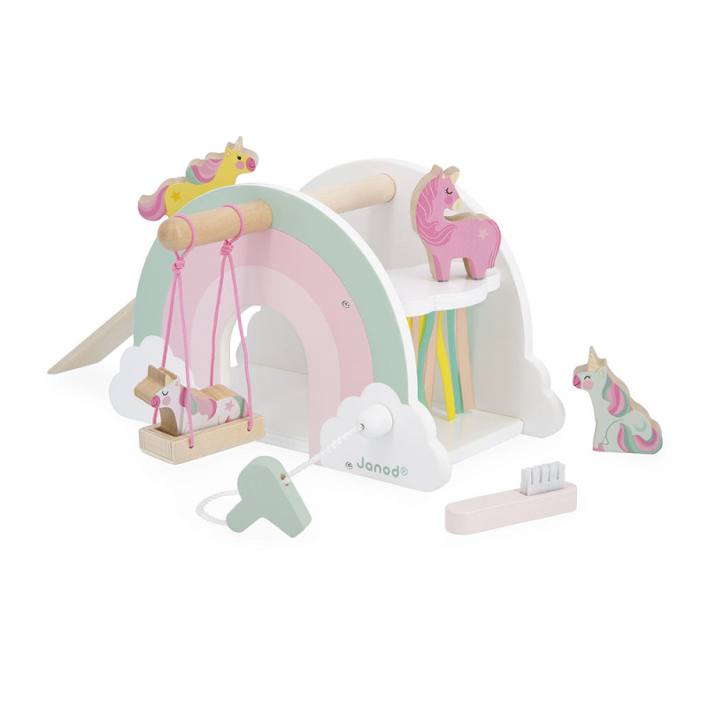 Drewniany domek jednorożców francuskiej marki JANOD to doskonała zabawka dla dziewczynki. W skład zestawu wchodzi piętrowy domek ze ściankami w kształcie tęczy, zjeżdżalnią, myjnią z tasiemek i zewnętrzną huśtawką. Ponadto w komplecie są 4 drewniane figurki jednorożców oraz szczotka i suszarka do ich pielęgnacji.