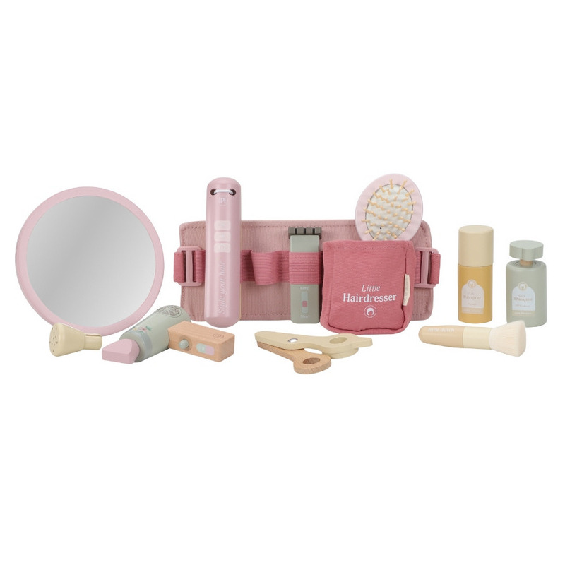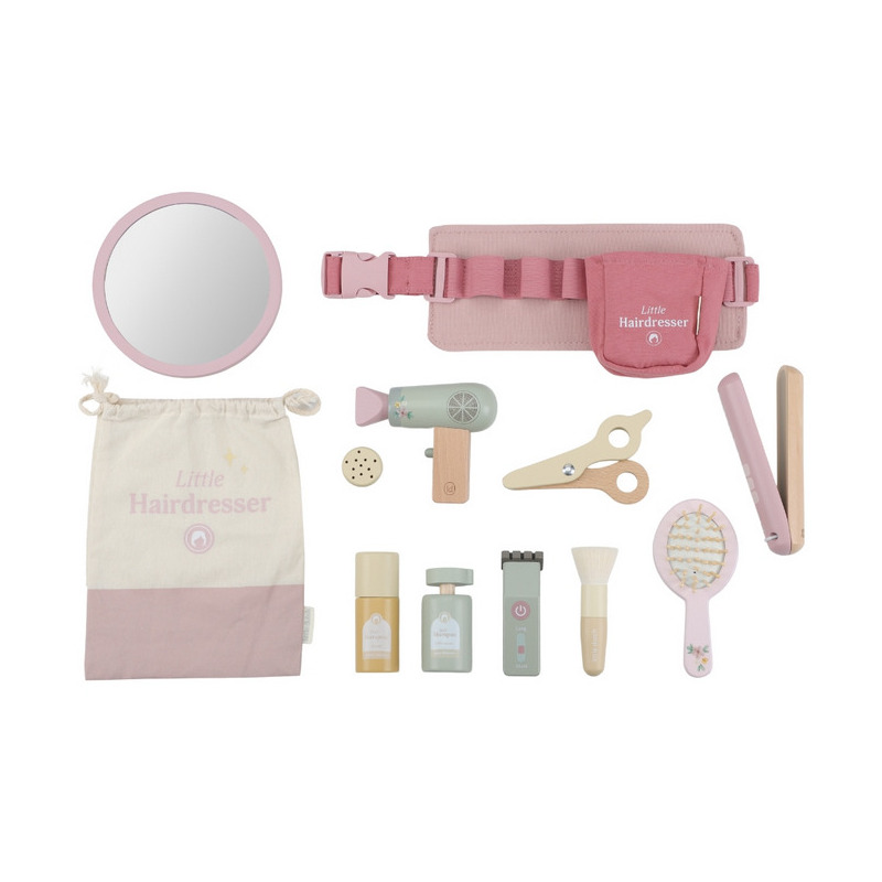 Twoje dziecko marzy o własnym salonie fryzjerskim? Ten zestaw od Little Dutch to idealna propozycja dla małych stylistów i stylistek! Dzięki niemu maluch może wcielić się w rolę fryzjera, ćwiczyć kreatywność i tworzyć wyjątkowe fryzury dla lalek, maskotek czy nawet rodziny. Regulowany pas biodrowy z akcesoriami sprawia, że wszystkie narzędzia są zawsze pod ręką – zupełnie jak u profesjonalisty. W zestawie znajdują się wszystkie niezbędne narzędzia fryzjerskie: nożyczki, suszarka, prostownica, maszynka, grzebień, szampon, lakier do włosów, żel do stylizacji i lusterko.