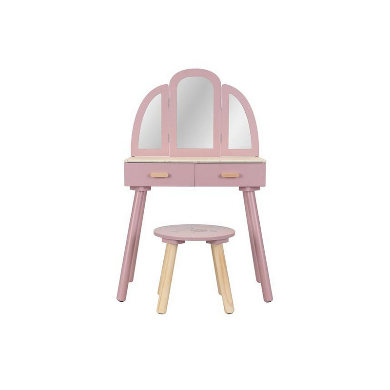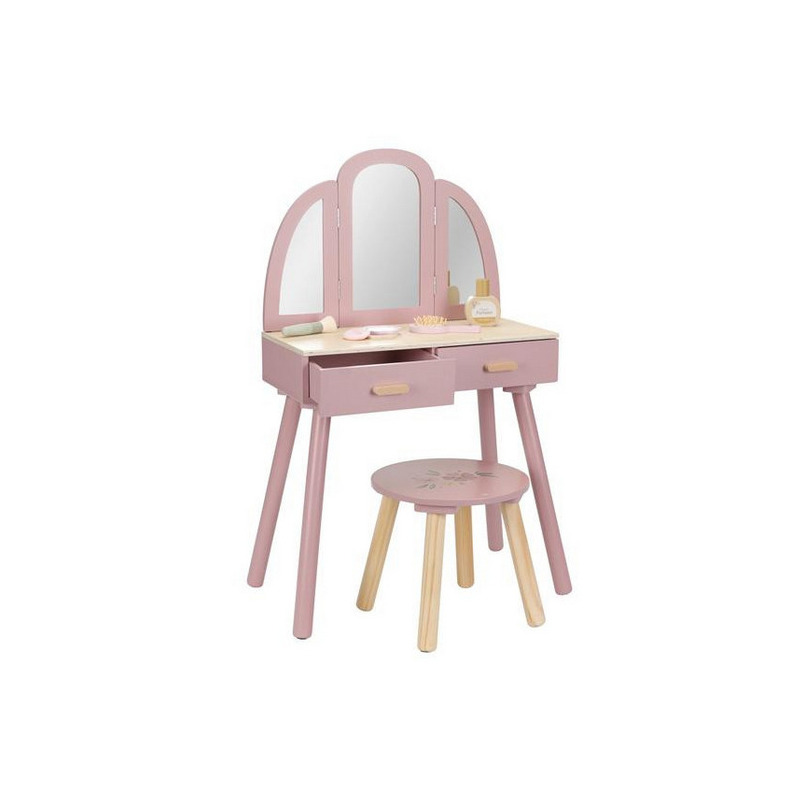 ZESTAW ZAWIERA: toaletkę z obrotowym lustrem, krzesełko oraz 6 drewnianych kosmetyków w zestawie (szczotka do włosów, szminka, flakonik perfum, róż do policzków, pędzelek i puszek do pudru).