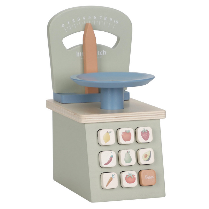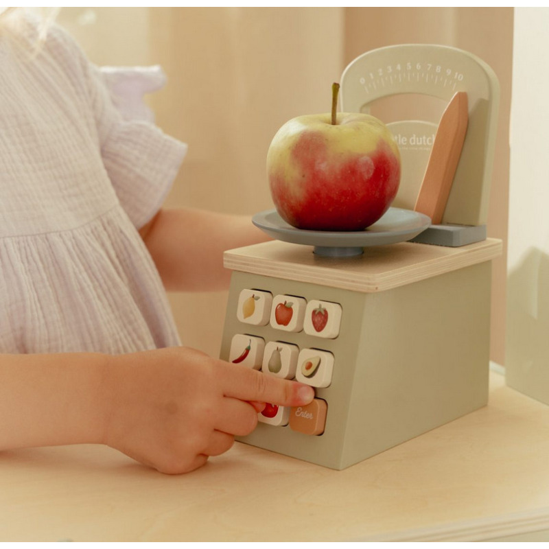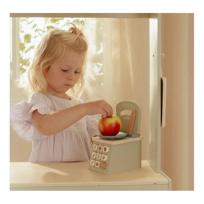 Zabawę świetnie uzupełni zestaw z deską do krojenia z owocami lub warzywami, drewniana kasa czy drewniana kuchnia marki Little Dutch (do kupienia oddzielnie).