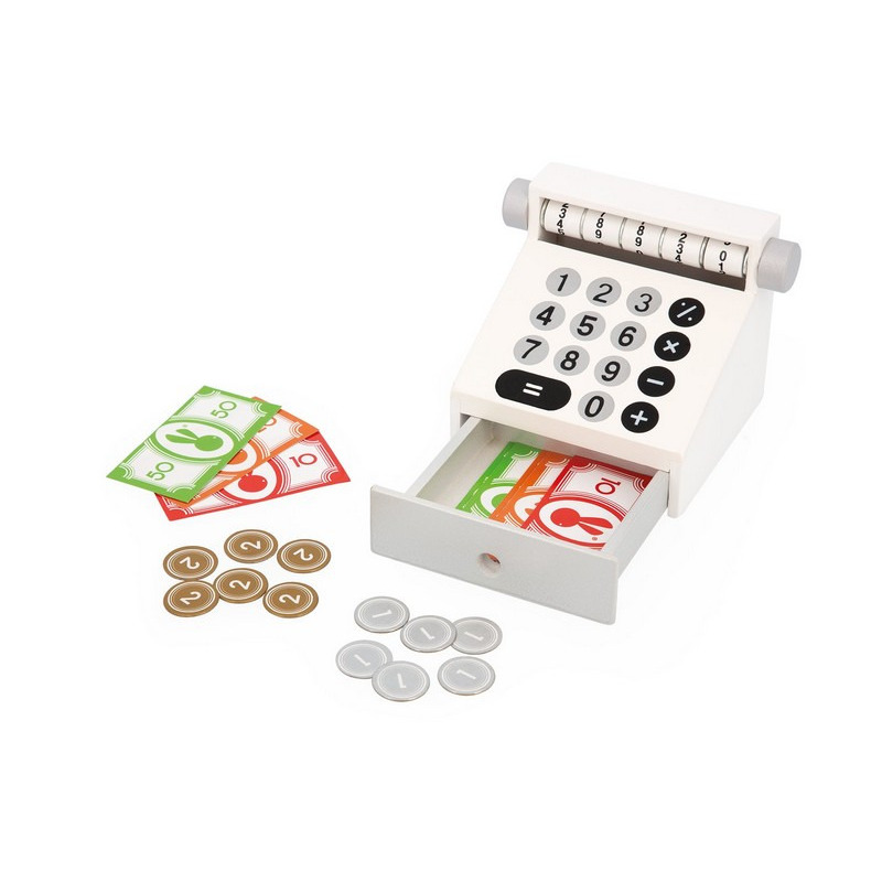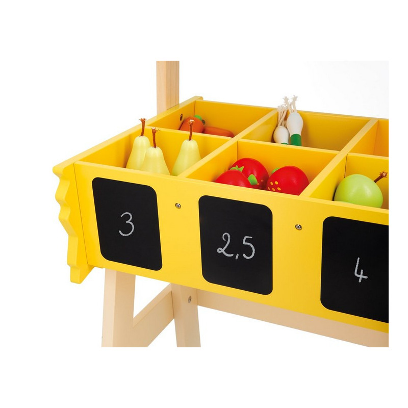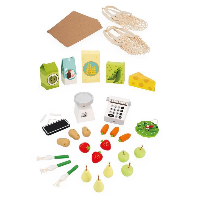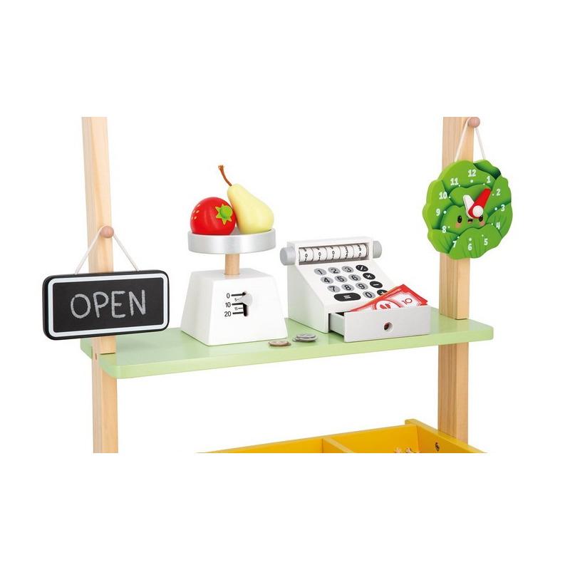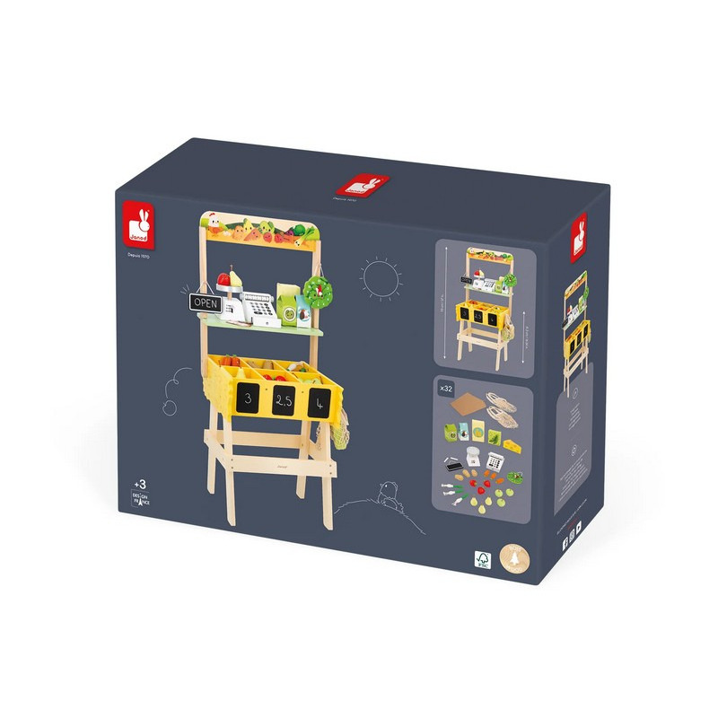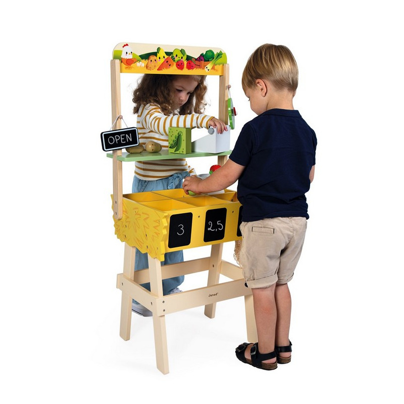DREWNIANY SKLEP duży straganik warzywniak z akcesoriami i kasą Farma Janod 3+
